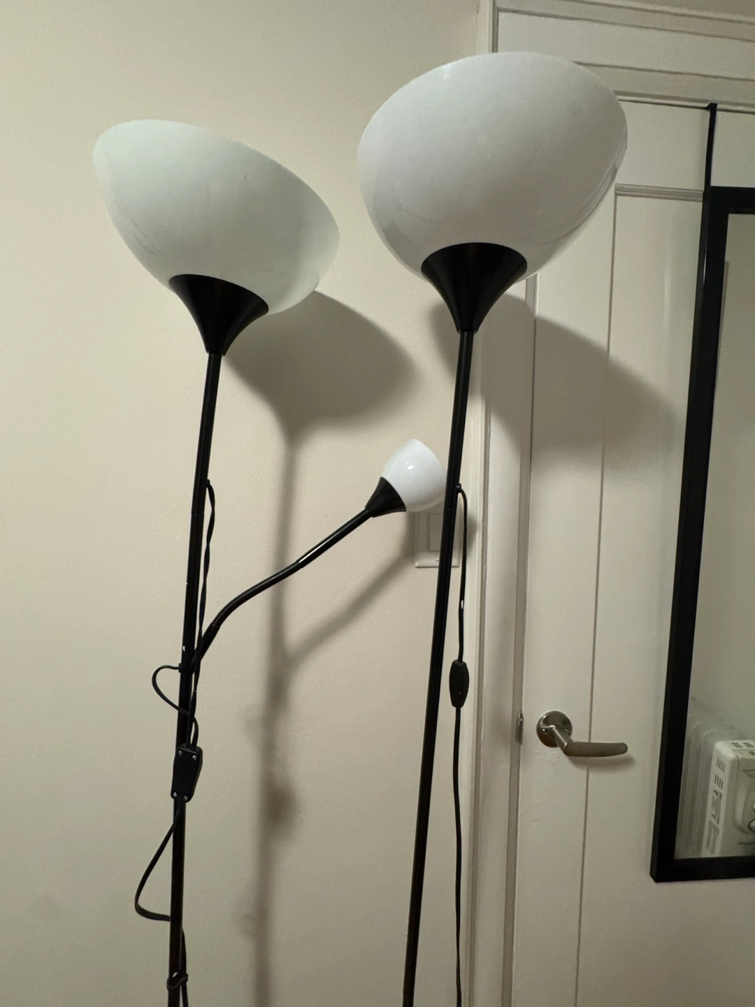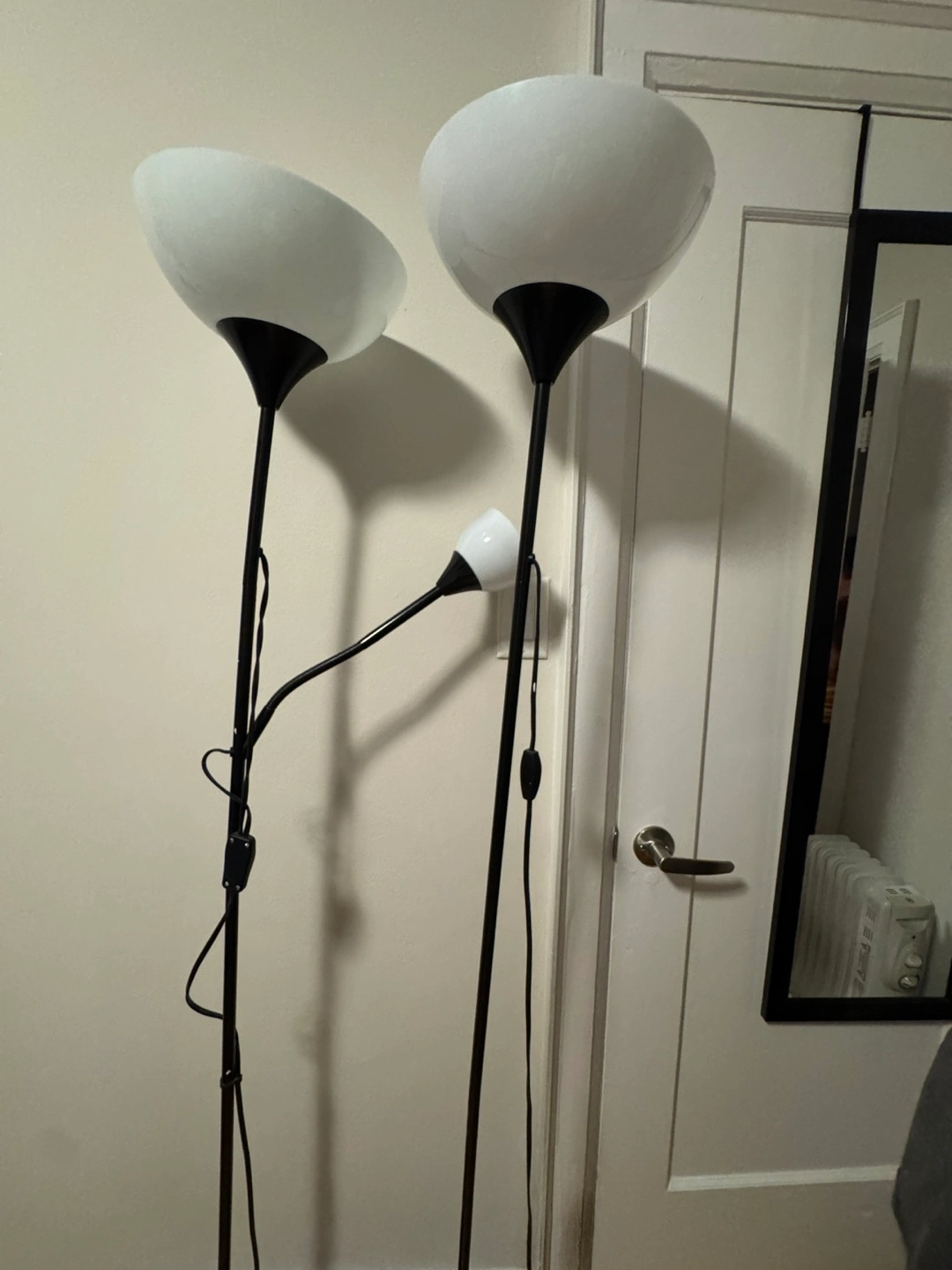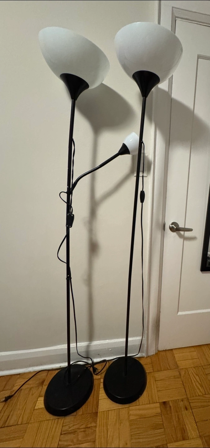 Selling an IKEA uplight/reading lamps in black. Set of two (2). It provides great ambient and focused lighting. The lamp has a main uplight and an adjustable reading light. Dimensions are: 71" height, 11.35" top shade diameter, and 20.47" base diameter