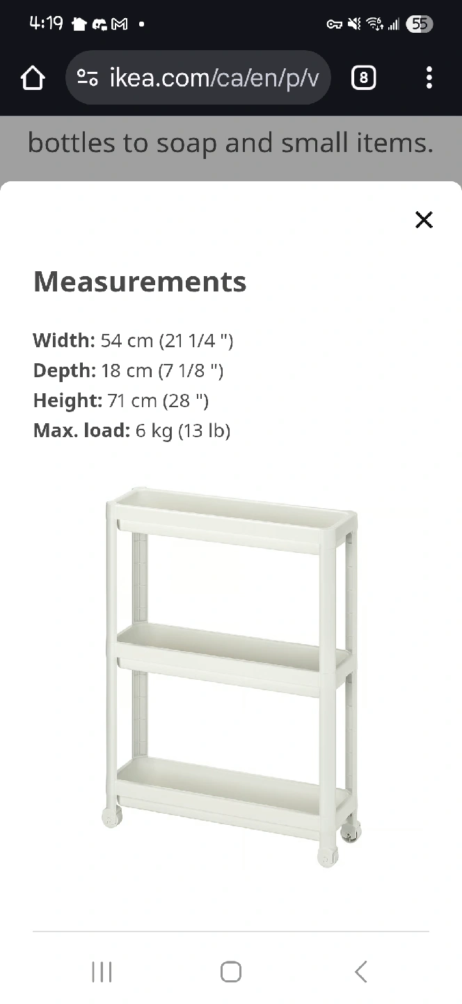 Selling a like-new IKEA VESKEN cart in white! relatively new, maybe 4 months in use, but im rearranging space and no longer need it! This cart is perfect for adding extra storage to your bathroom, kitchen, or any small space. It's lightweight and easy to move around, with dimensions of 54x18x71 cm (21 1/4x7 1/8x28 "). A great way to keep your bottles, soaps, and small items organized