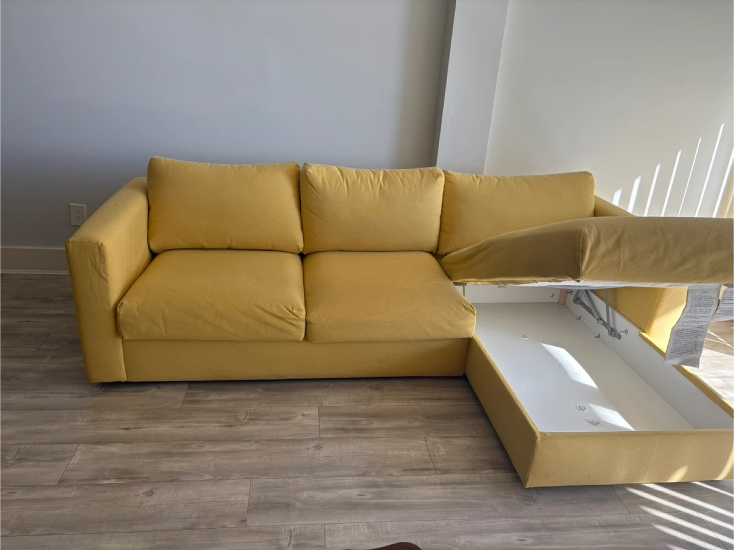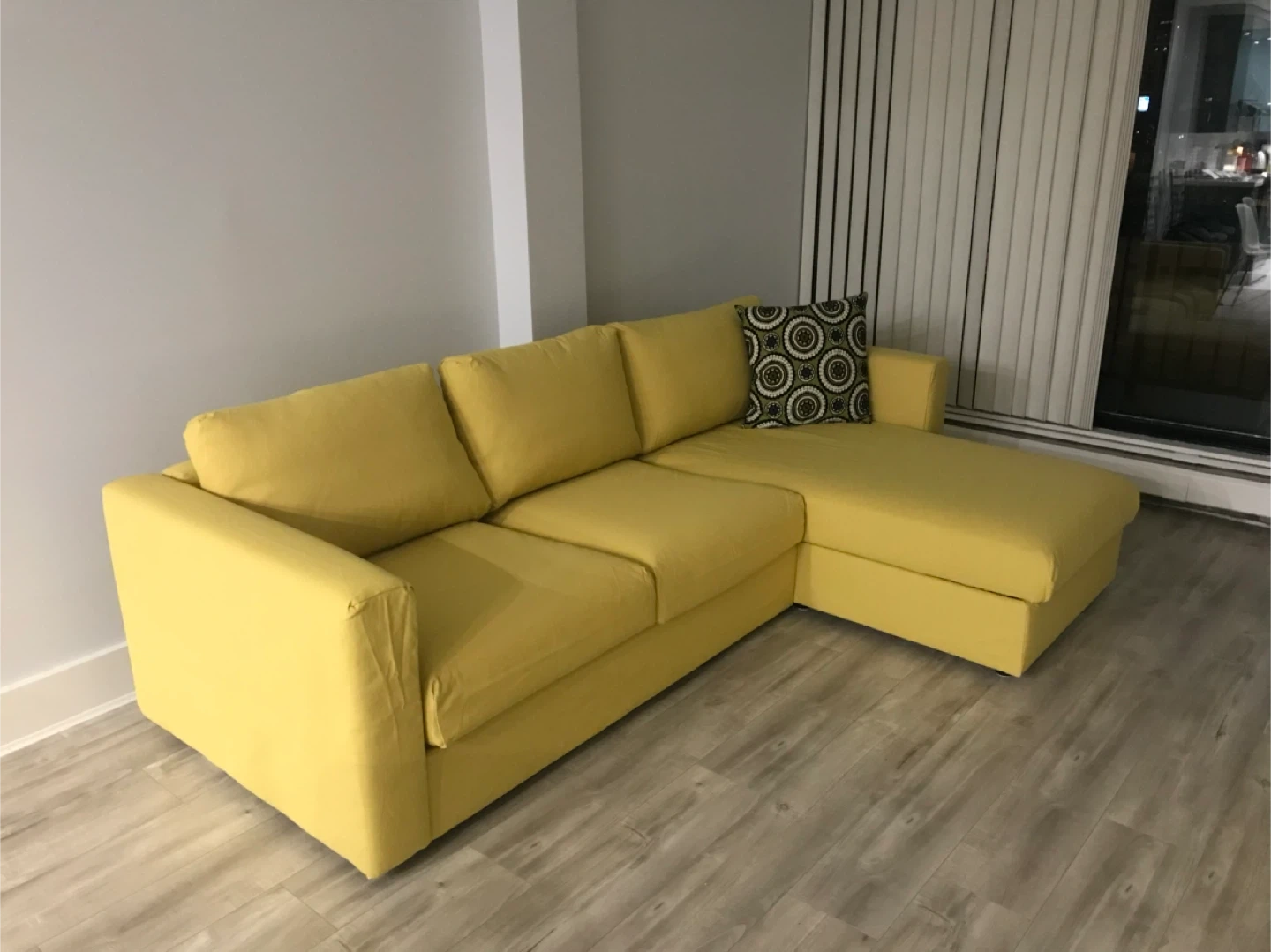 Looking to sell my IKEA Vimle sofa with chaise. It's in great condition and has a handy storage compartment under the chaise lounge. The yellow colour adds a nice pop of sunshine to any room. It's super comfy and perfect for relaxing after a long day. If you're interested, send me a message!