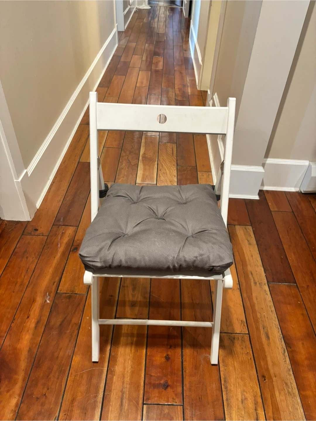 Selling a white folding chair, perfect for extra seating when you have guests over! It comes with a comfy grey cushion. It’s in great shape and folds up easily for storage when not in use. A simple and practical addition to any home!