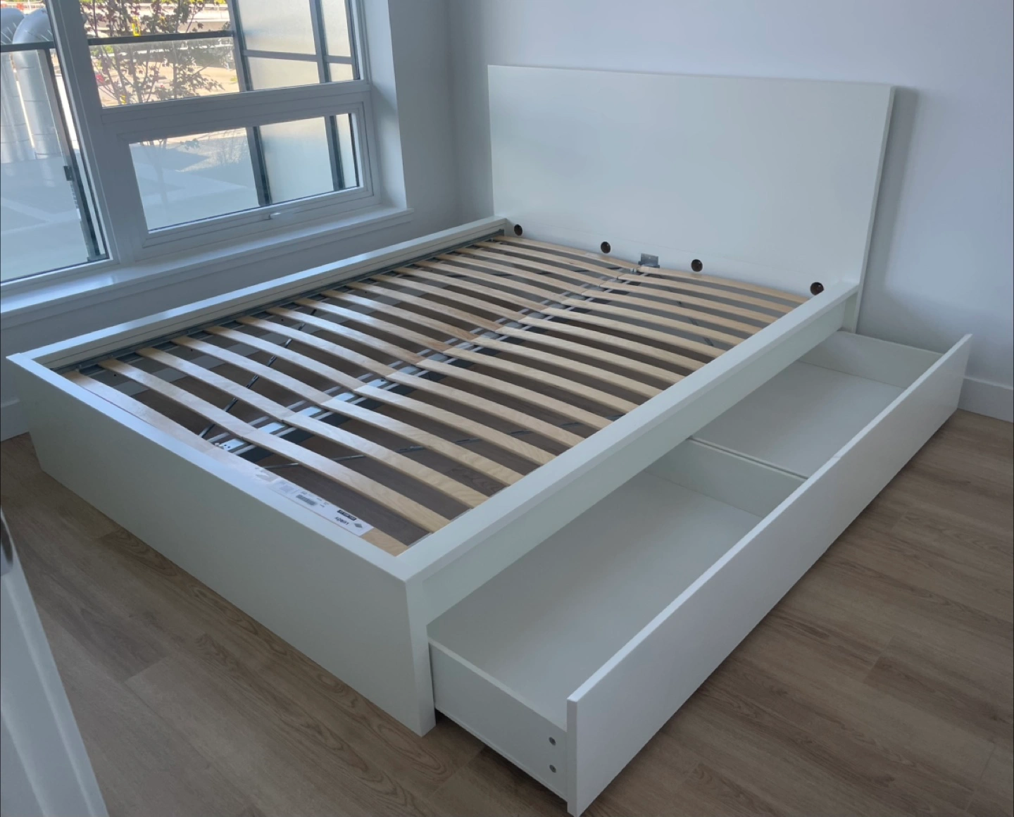 Excellent Condition IKEA Queen Size Malm bed frame with 2 under bed pull out storage box drawers finished in white. All hardware, tools, instructions and slats included. Pet free smoke free bedroom home. Dimensions are in the last picture. $300 *No mattress included