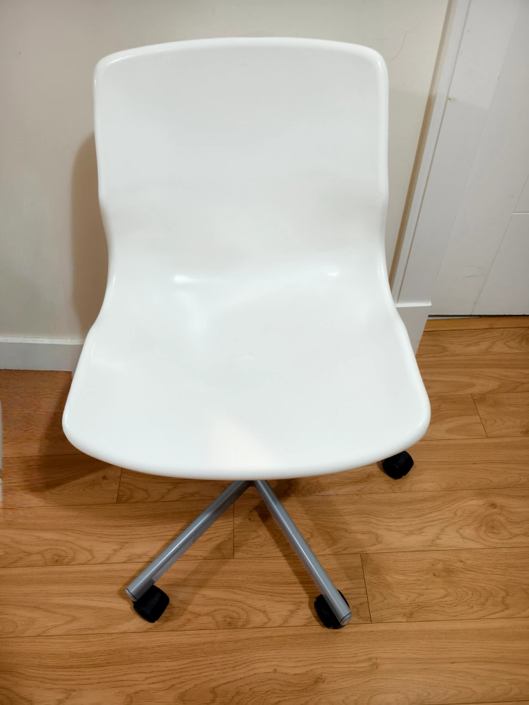 Selling a simple and clean white swivel chair! It's in great shape and would be perfect for a home office or student desk. The chair has a comfortable seat and back, and the swivel base makes it easy to move around. It's a practical and stylish addition to any space