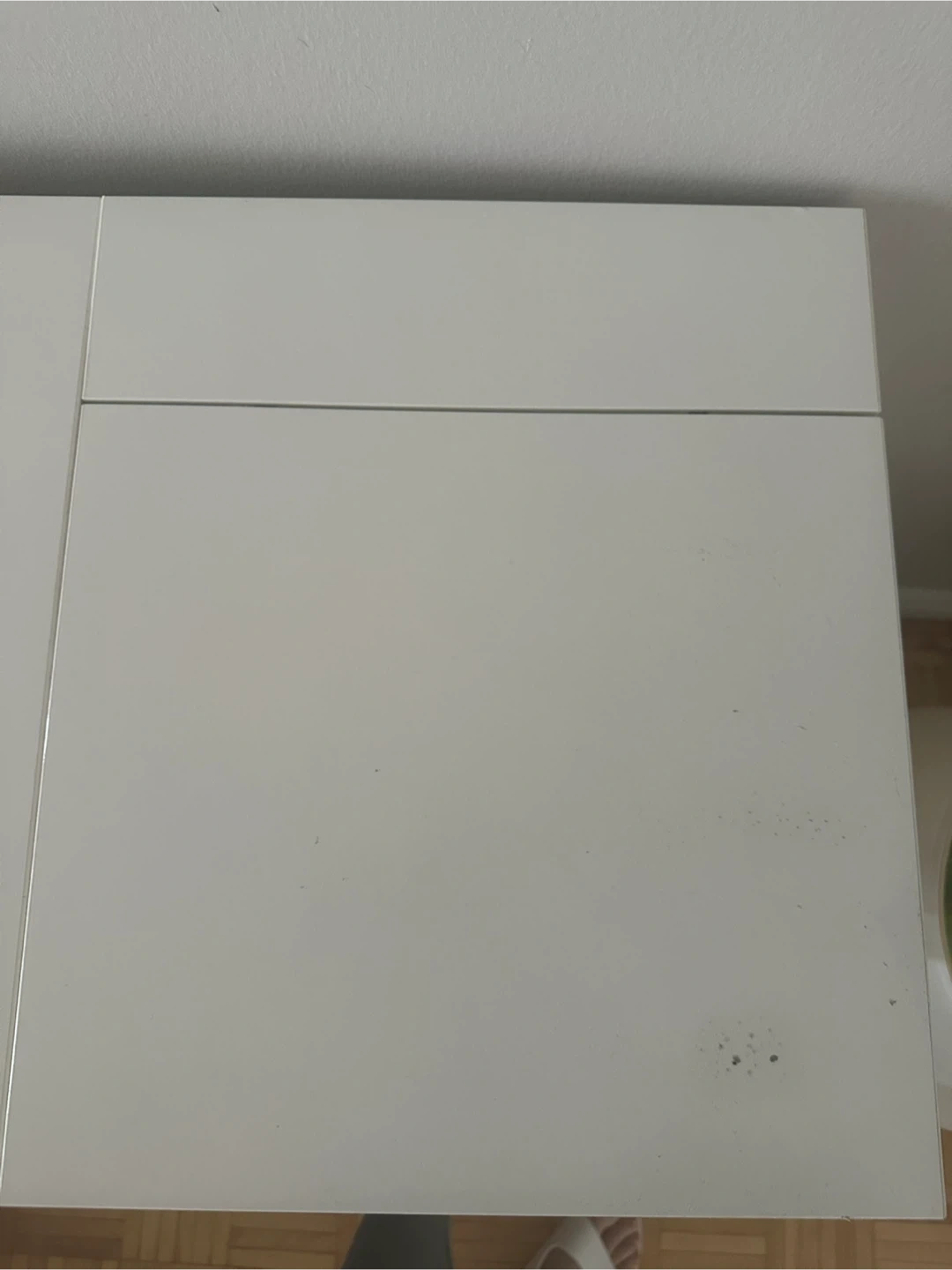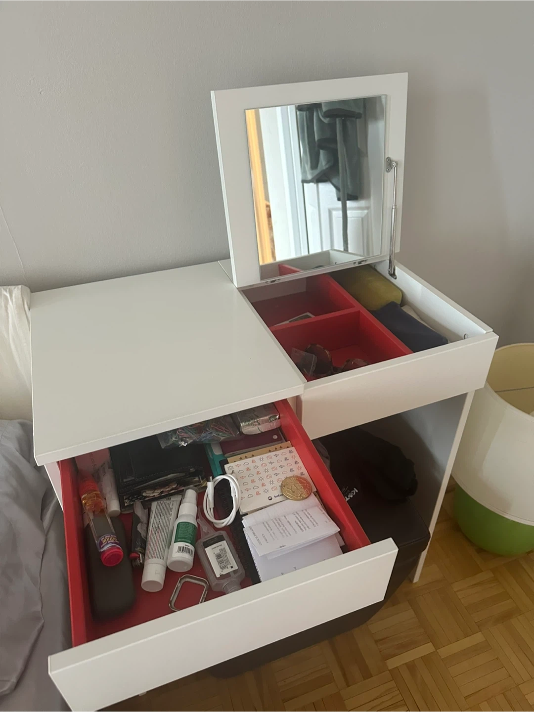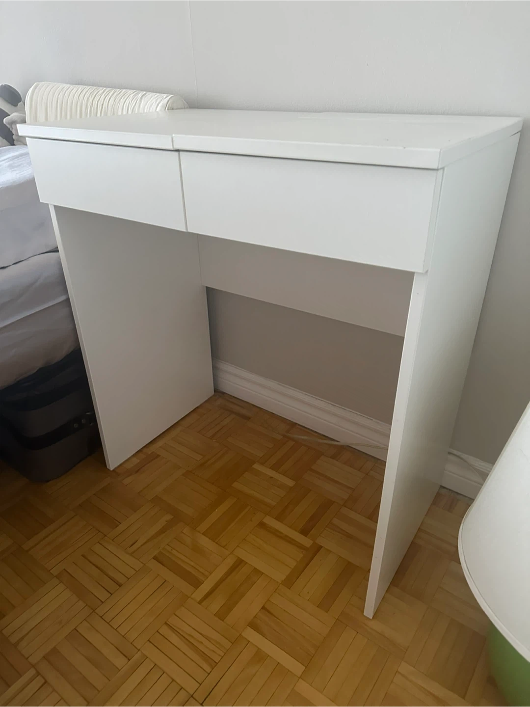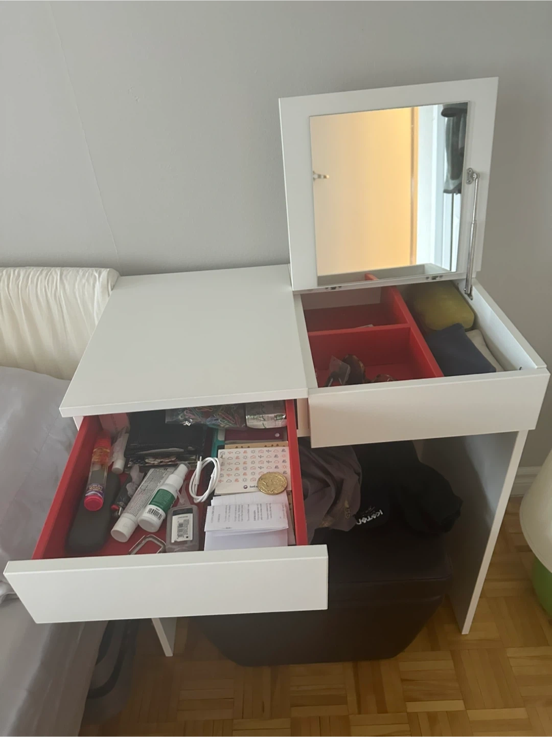 Selling a white vanity desk with a mirror. It has a clean design and offers a good amount of storage space with its drawers. Perfect for getting ready in the morning or setting up a workspace. (There are few spots on the cover as shown in the image)