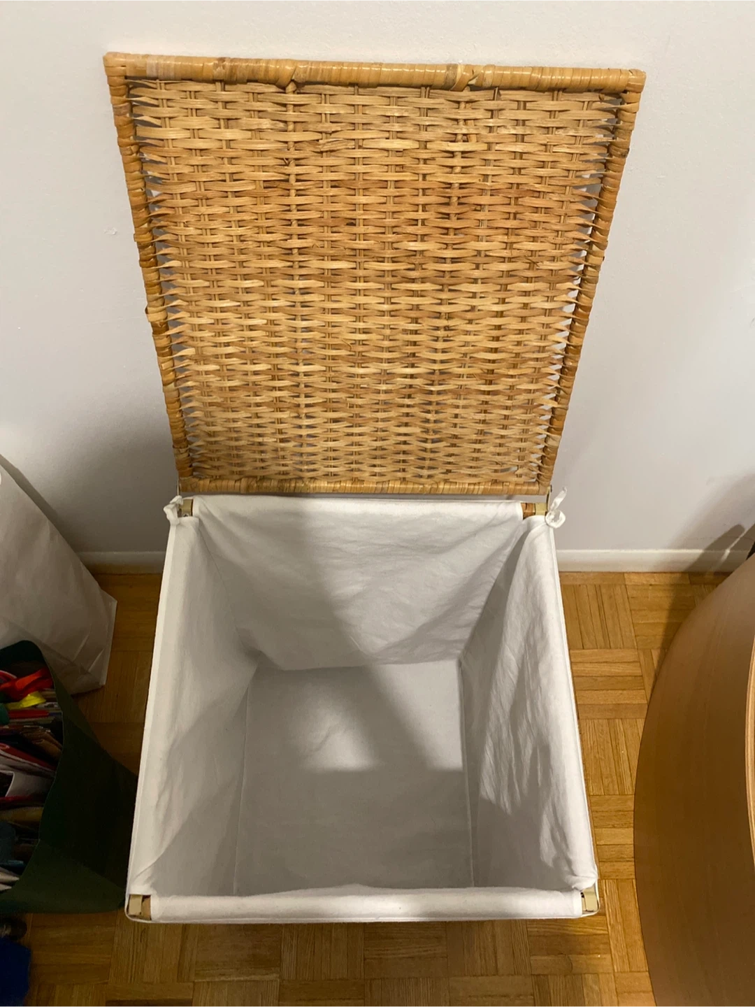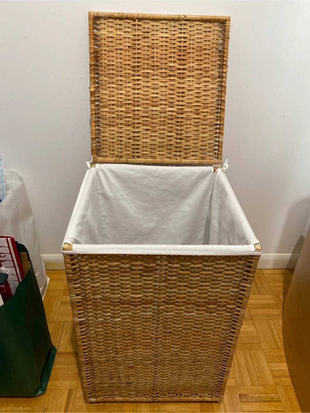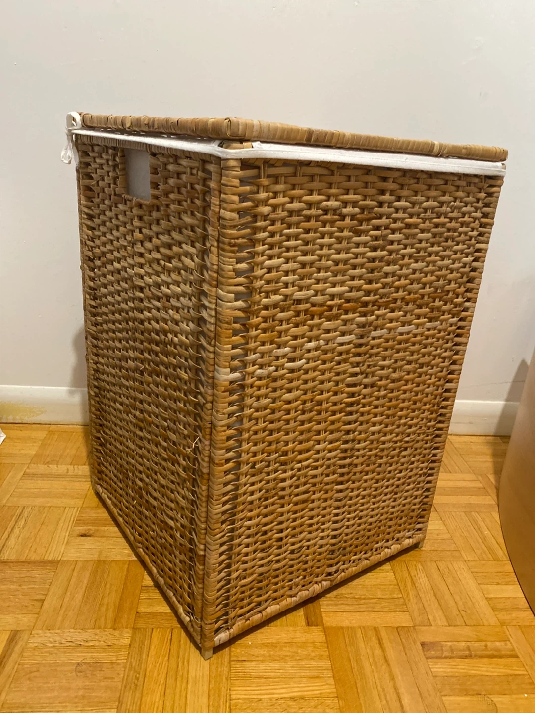 Selling a wicker laundry hamper with a lid. It has a removable white fabric liner inside. Great for keeping your laundry organized and out of sight!