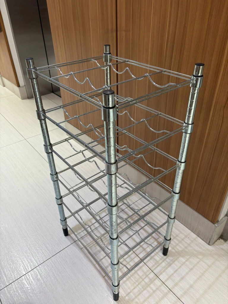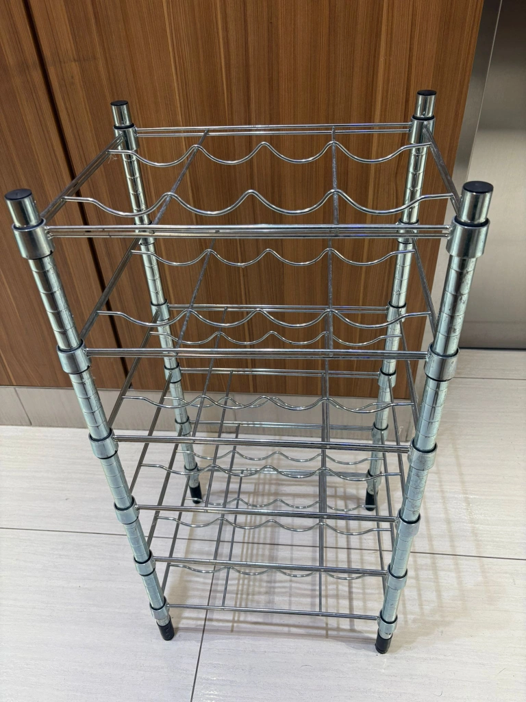 Selling a chrome wine rack, perfect for storing your favourite bottles. It's in great shape and ready to use in your home! As good as new. 6 shelves Holds 24 bottles. Shelves can be adjusted to different heights. Also stands steady on an uneven floor since the feet can be adjusted. Can also be used in damp areas indoors. Measurements: 46x36x94 cm (18 1/8" x 14" x 37 ")