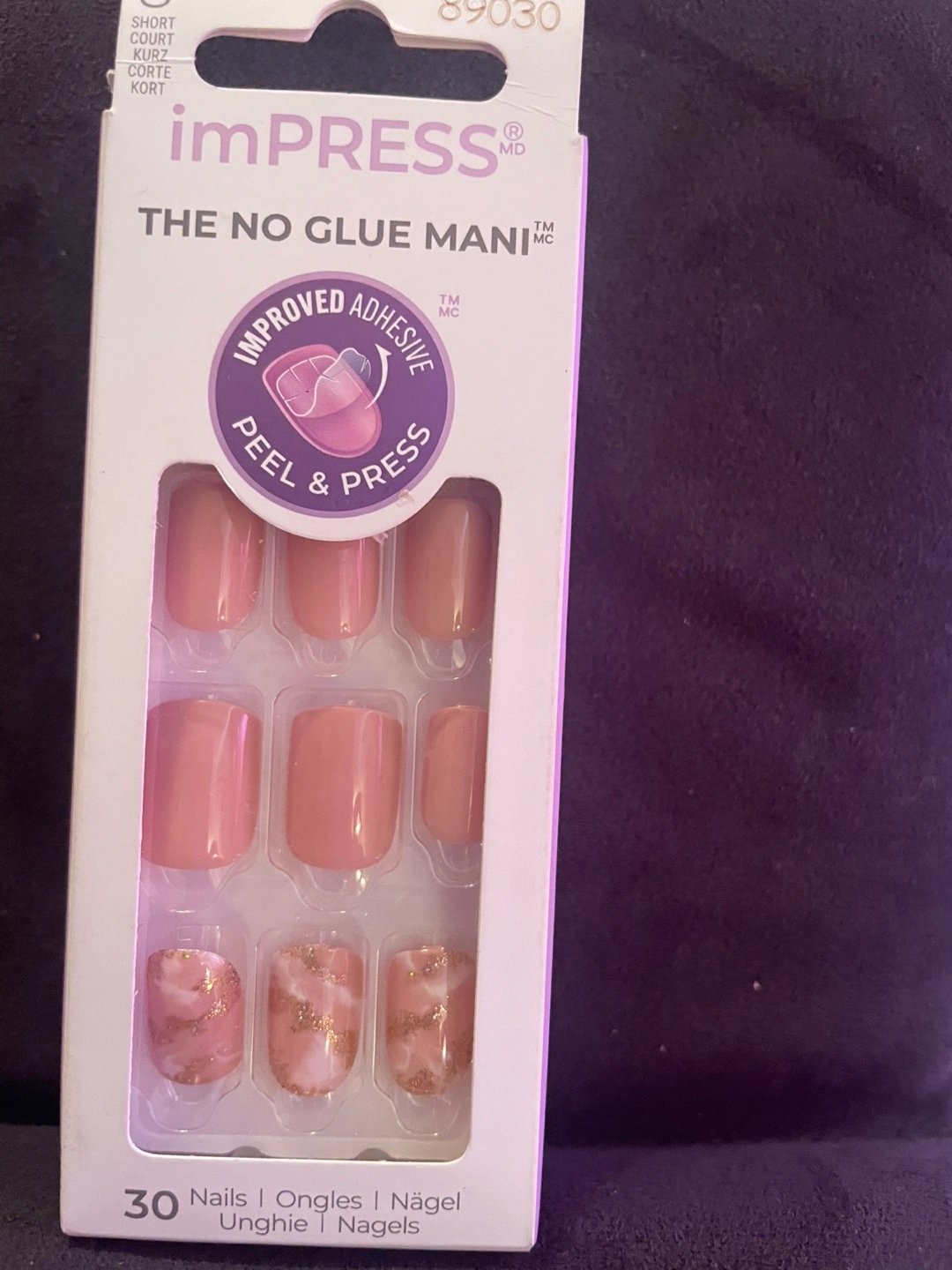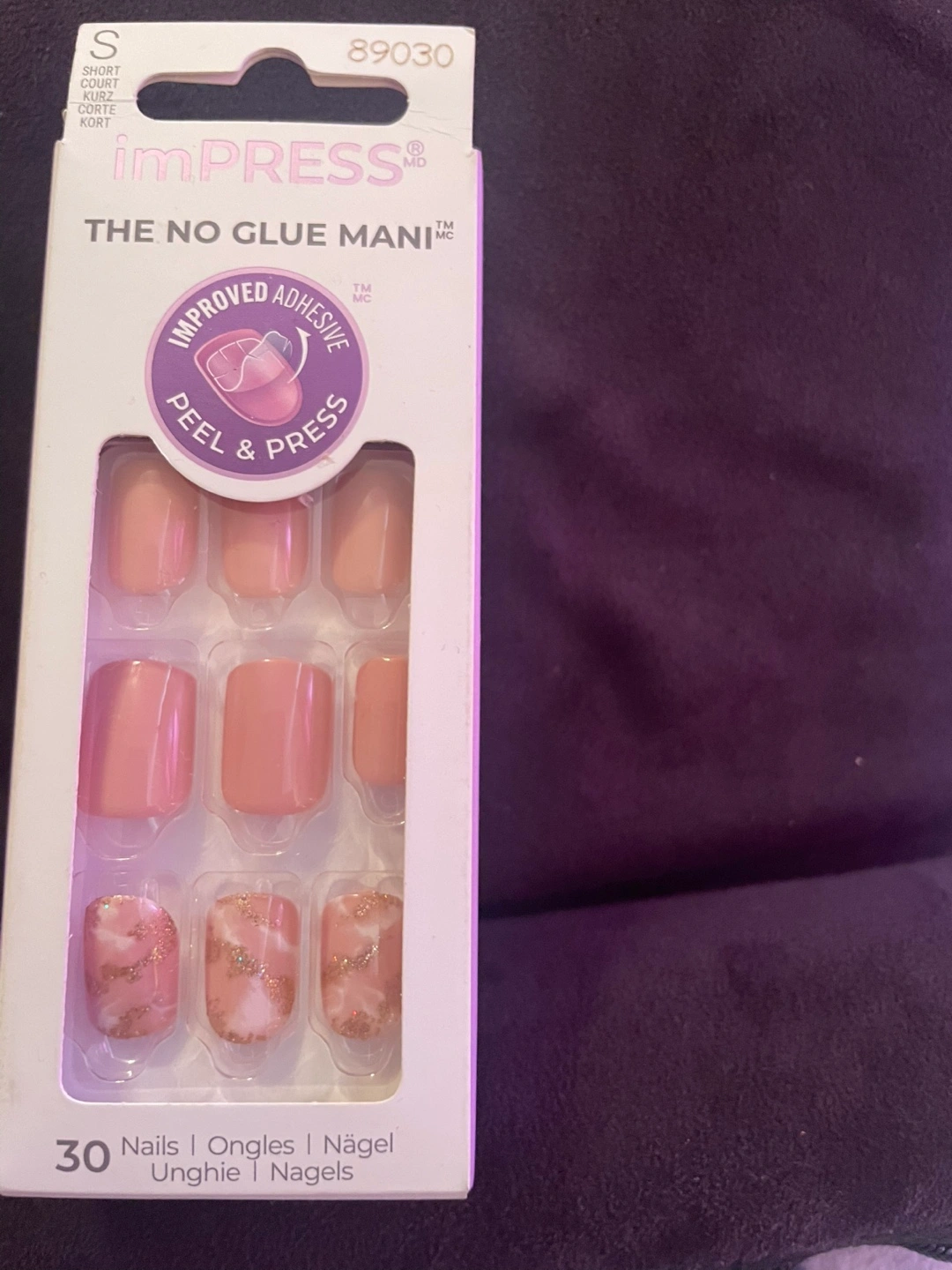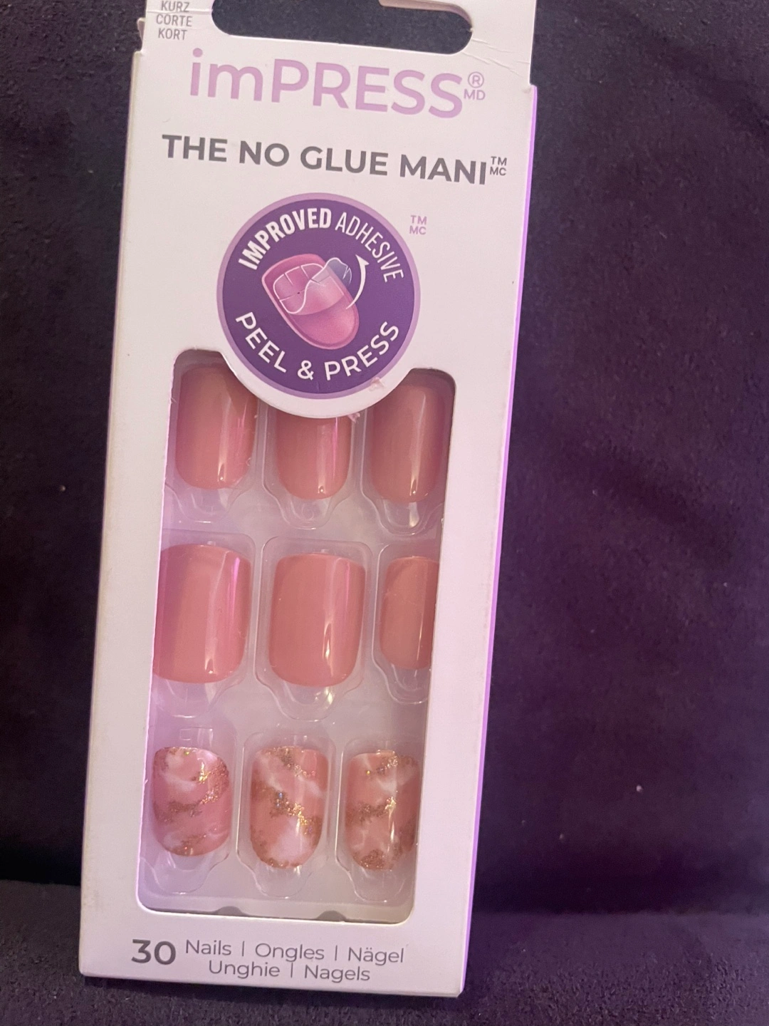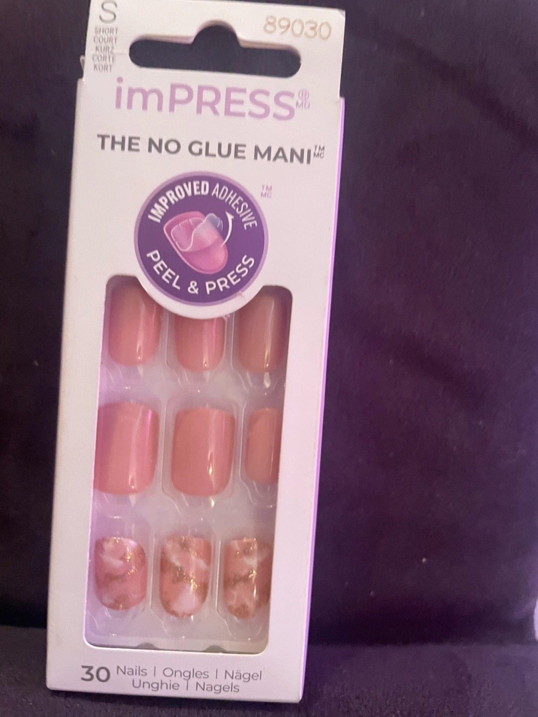 Selling a brand new set of imPRESS The No Glue Mani nails! This set includes 30 nails, a prep pad, a mini file, and a manicure stick. They're easy to apply with improved adhesive - just peel and press!