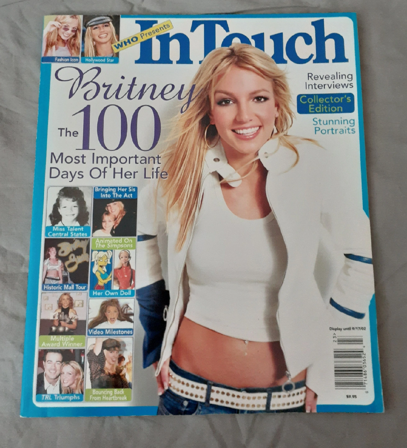 Selling an In Touch magazine featuring Britney Spears. It's a collector's edition with revealing interviews and stunning portraits. It highlights the 100 most important days of her life