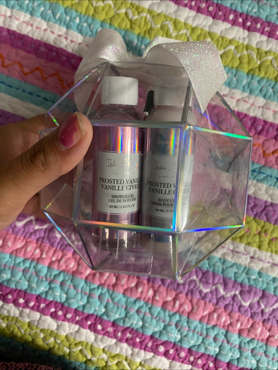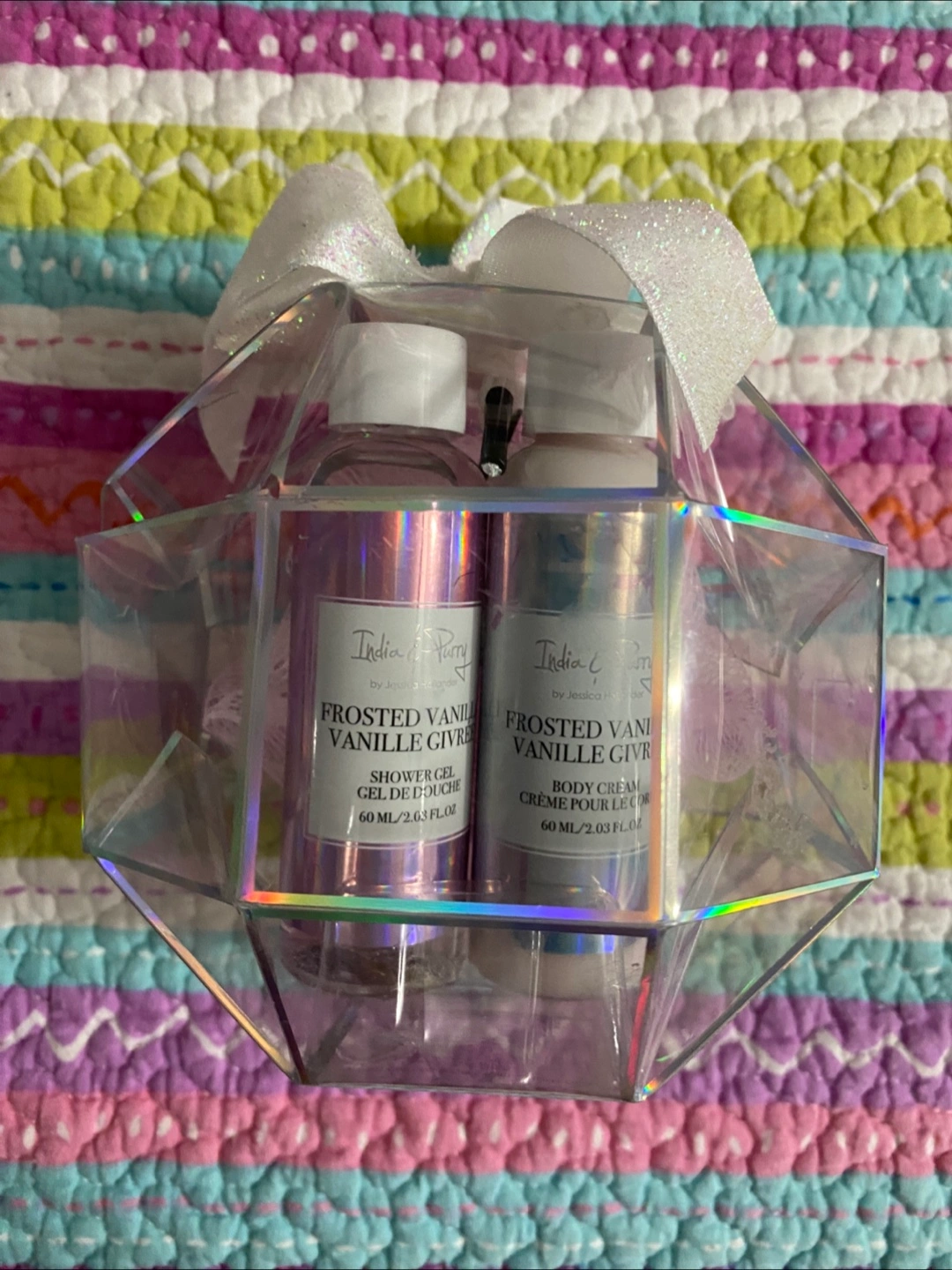 India & Purry Frosted Vanilla gift set includes a shower gel and body cream. Each bottle contains 60 mL / 2.03 fl oz. Perfect as a little treat for yourself or a gift for someone special!