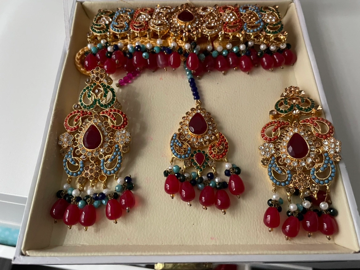 Gold and red statement jewellery set with earrings, a choker, and a tikka.