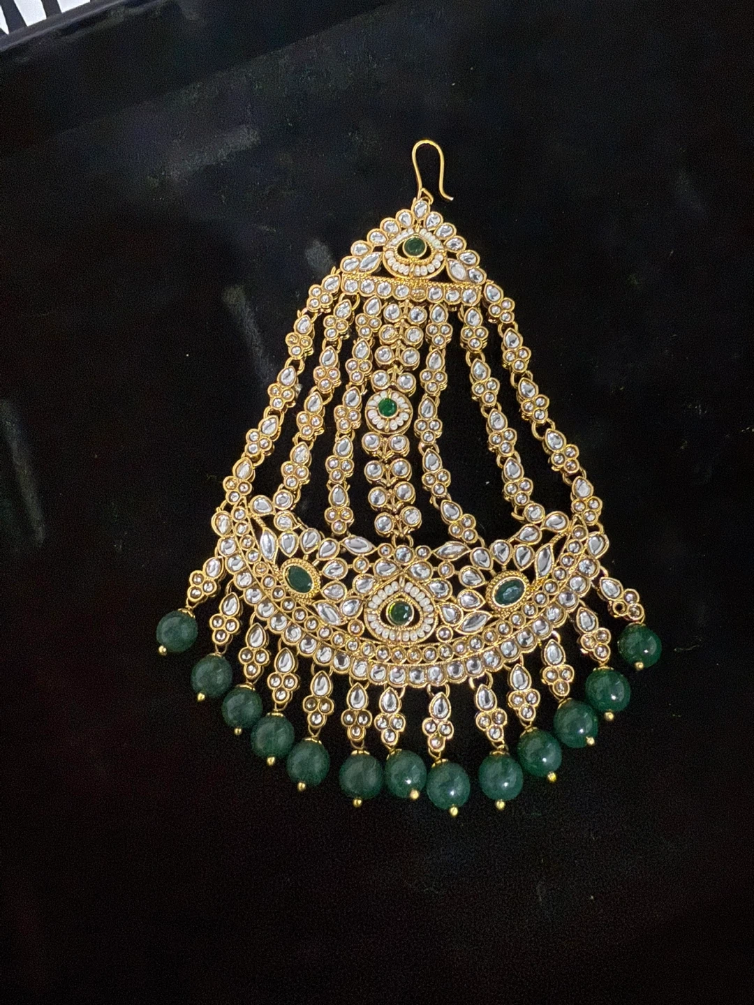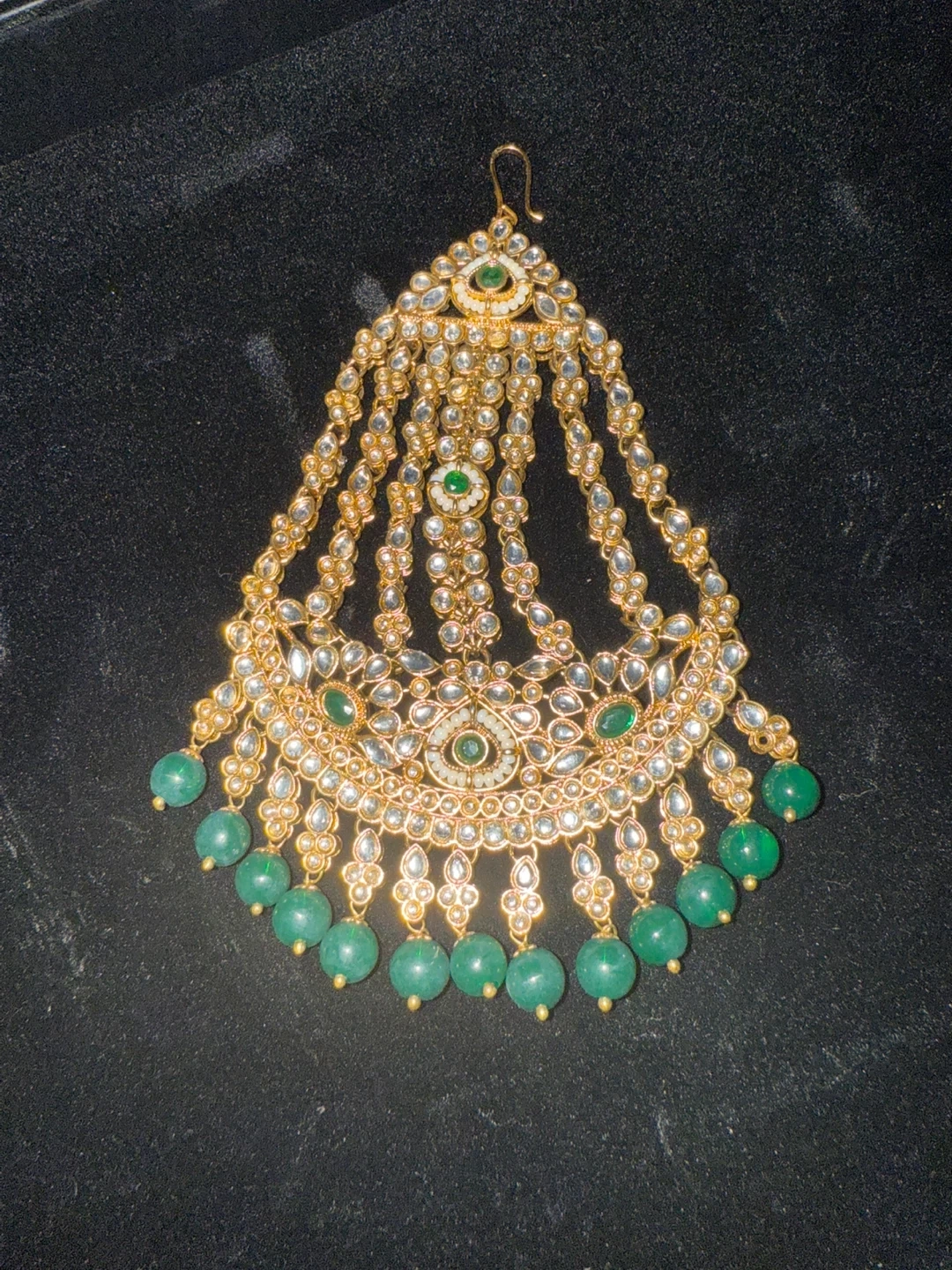 Selling a beautiful Indian bridal/ non bridal kundan passa. It features gold-tone detailing with green and kundan stones. Perfect for a wedding or special occasion!