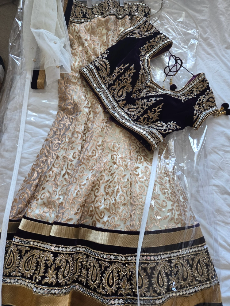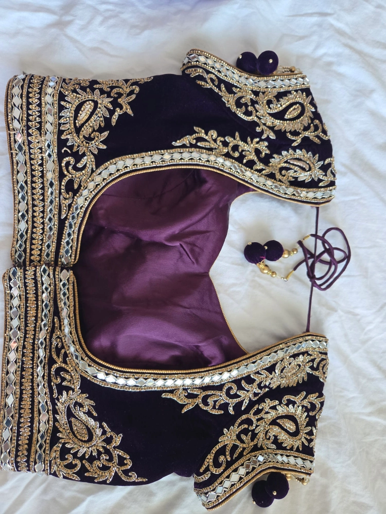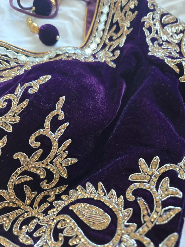 Selling a beautiful Indian Lehenga Choli set! This set features a gorgeous purple velvet blouse with intricate embroidery and mirror work, paired with a coordinating skirt and dupatta. Perfect for a special occasion or celebration! size is about 40( medium/large) but can be adjusted smaller or bigger