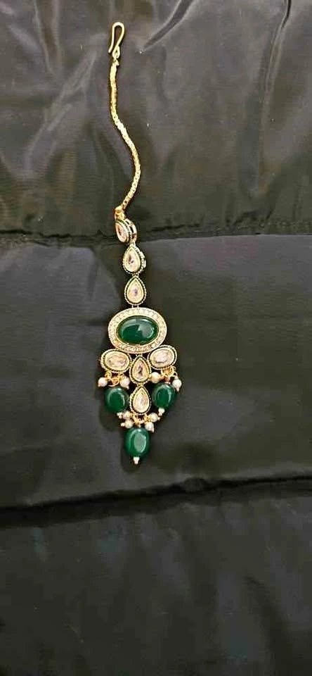 Simple yet elegant green/gold mang tikka with beads/stones. Bought for 35$. Brand new, never used!