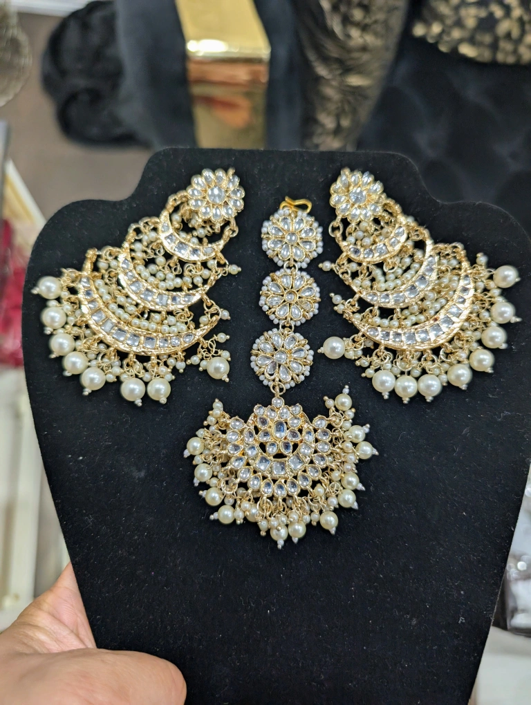 Beautiful jewelry set, perfect for weddings or special occasions! Includes earrings and headpiece. The set is gold with pearl accents, adding a touch of elegance to any outfit