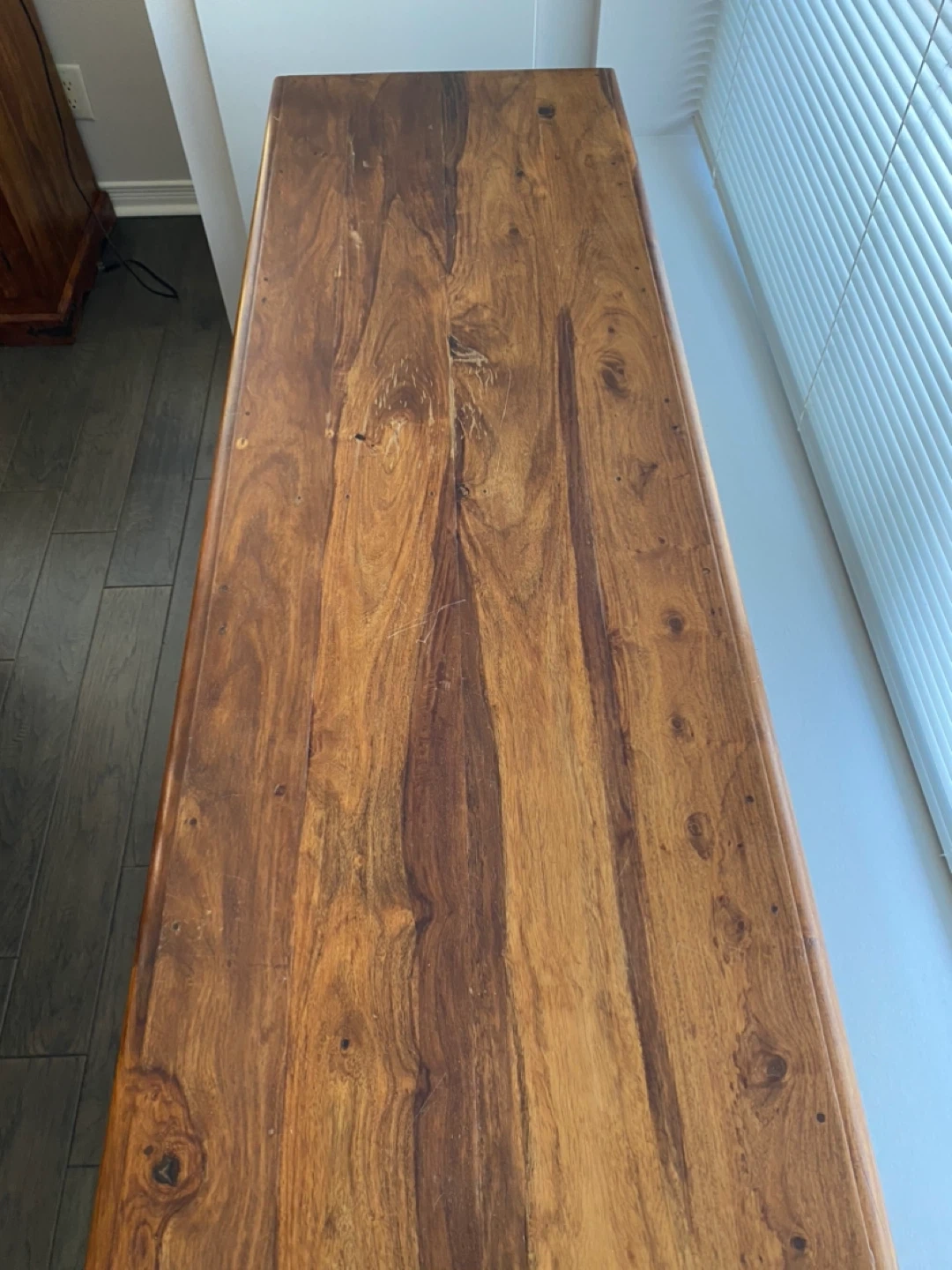 Solid Indian rosewood table. Can be used as desk, hallway entry table or console table. Unfortunately, I need to sell as I moved to a smaller condo. Rustic style with cast iron detailing. One of the legs is a bit wobbly and needs to be tightened. Measurements: 60 in long, 18 in deep, 30 in high