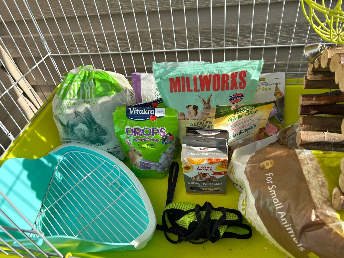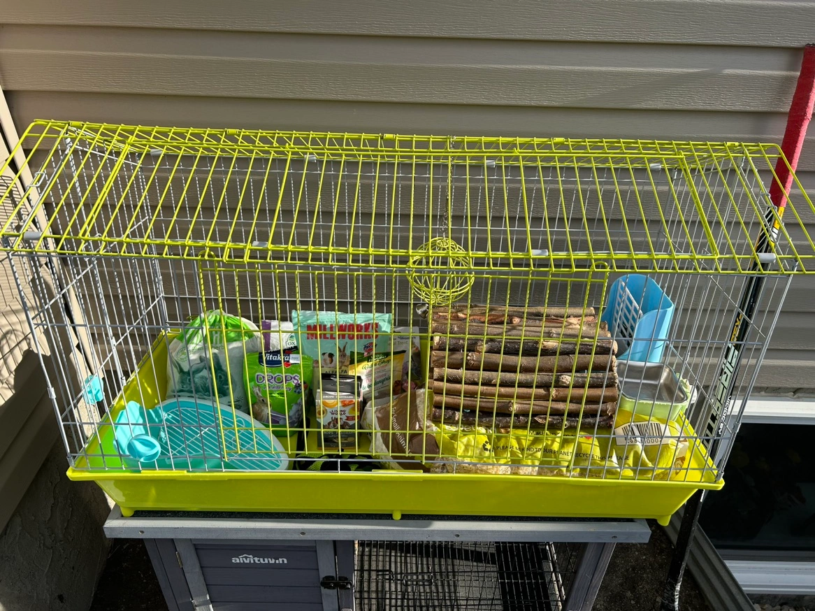 Bunny cage with everything you need. Water dish, food dish, Hideout, potty place, Bin over 1/4 Food, treats, harness leash, shavings, Timothy Hay, Bell Toy. All for $40. Pick up in Summerhill Area.