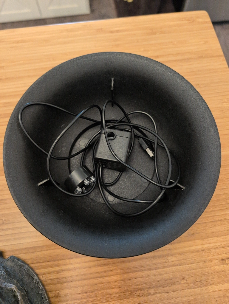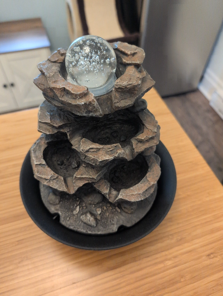 Selling an indoor water fountain that features a bubbling glass ball. It comes with all the necessary components. It's a great way to add a calming and relaxing atmosphere to your home. I just got a kitten and he wants to drink out of it so I sadly can't keep it. It works beautifully and I can show you how to hook it up! It requires a USB connection for power.