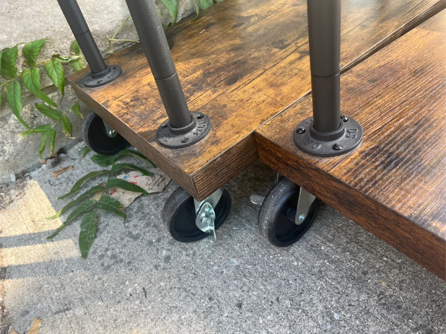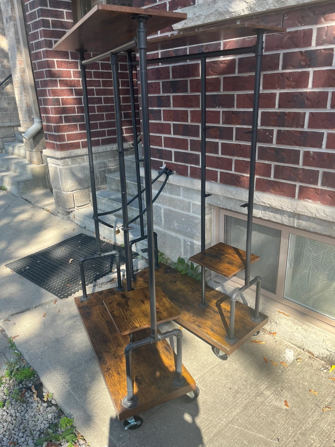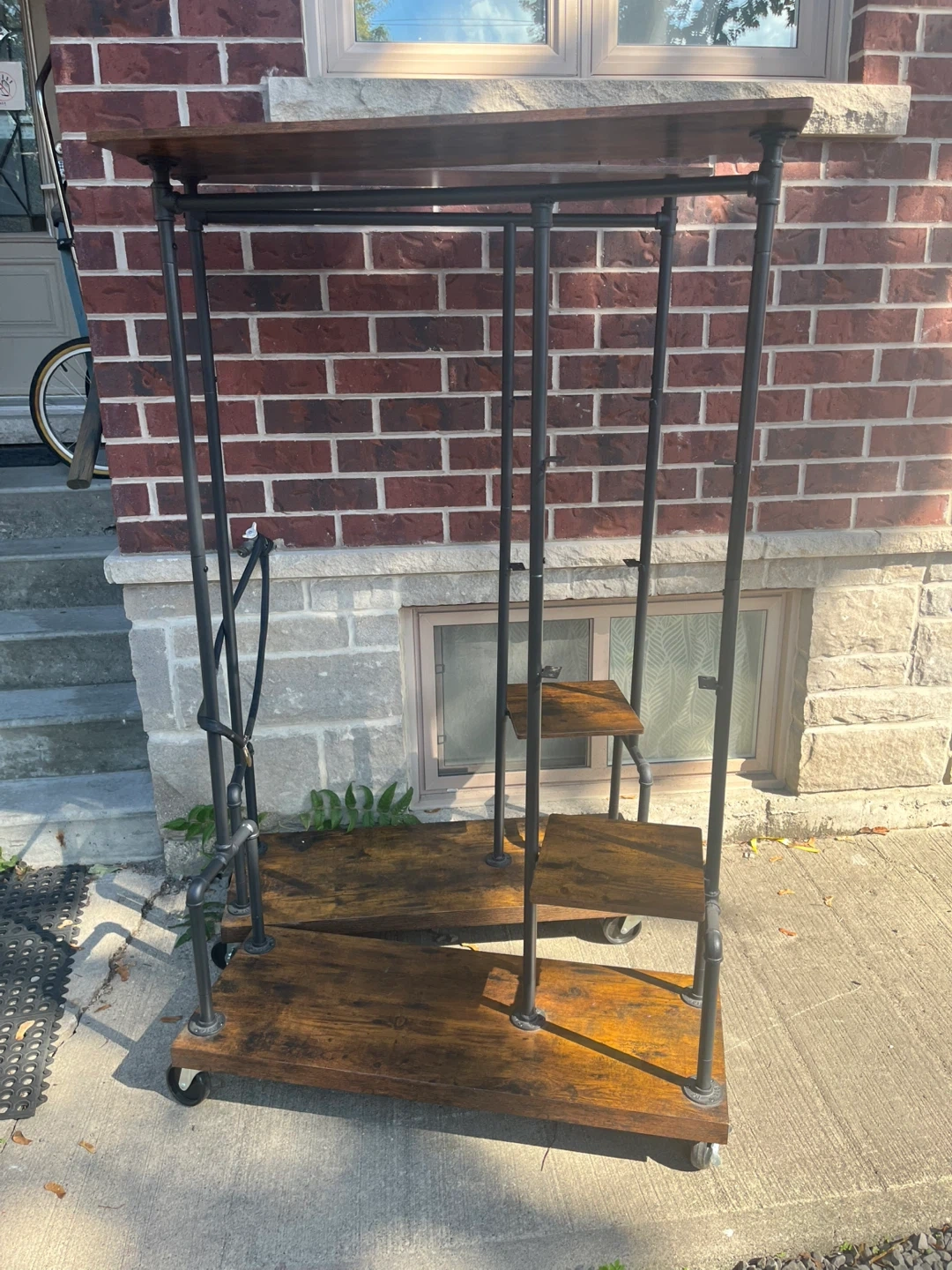 This industrial style rolling garment rack is perfect for adding some extra storage to your space! It features a sturdy metal frame with wooden shelves and smooth-rolling casters. A few shelves missing. Great for organizing clothes or displaying items in a unique way! In good condition. 150 each.