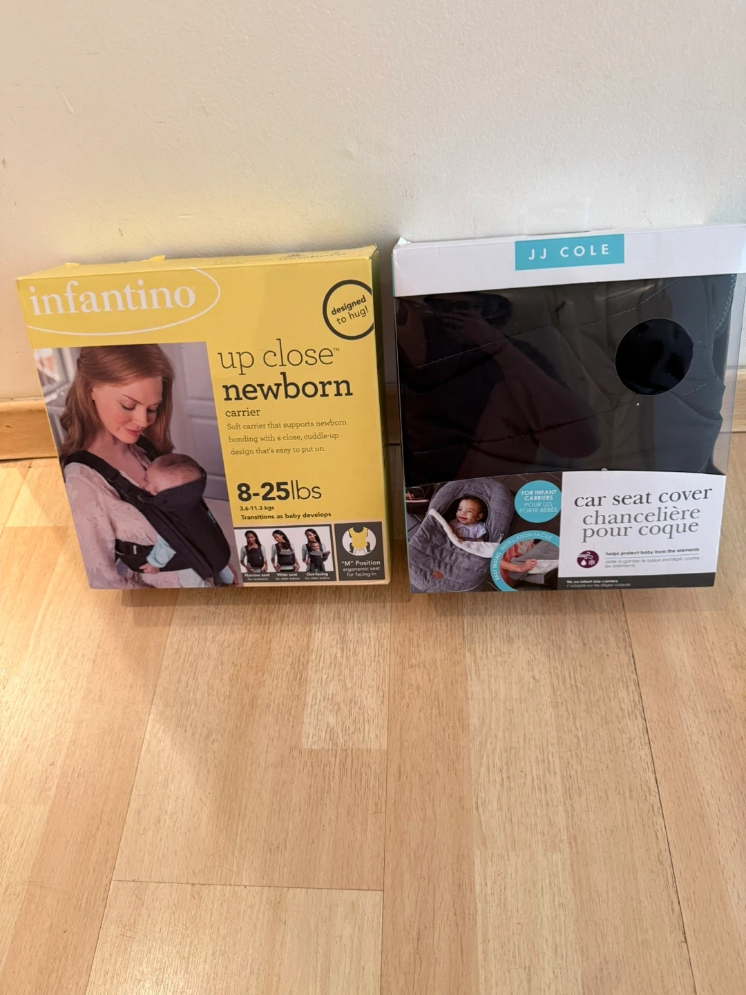 Selling an Infantino Up Close Carrier, designed to hug! It's a soft , easy-to-put-on design. Suitable for babies weighing 8-25 lbs. Also included is a JJ Cole car seat cover. $15 - each $25 for both