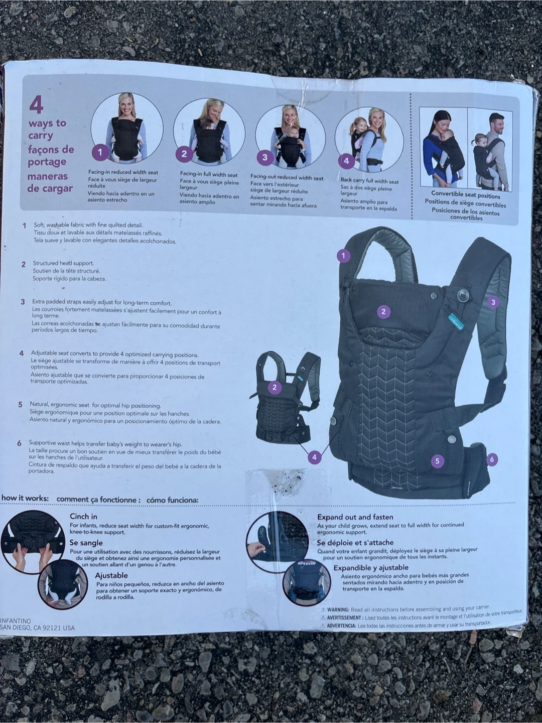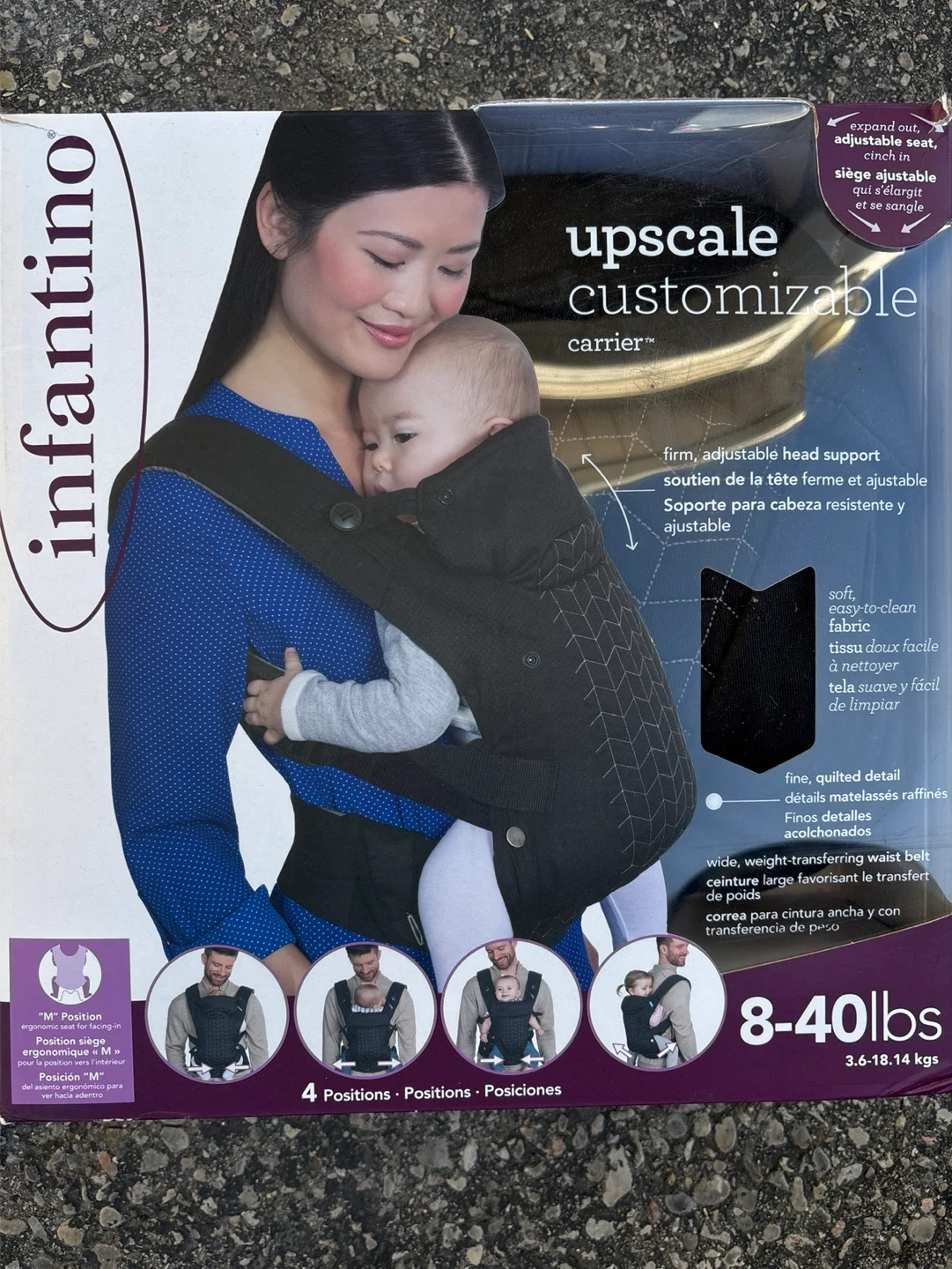 Get ready to carry your little one in style with this Infantino Upscale Customizable Carrier! It's in like-new condition and ready for a new home. Features include: - Firm, adjustable head support - Soft, poly-to-clean fabric - Fine, quilted detail - Wide, weight-transferring waist belt - Supports babies from 8-40lbs (3.6-18.14 kgs) This carrier offers 4 positions for carrying your baby and is designed for comfort and convenience for both you and your little one.