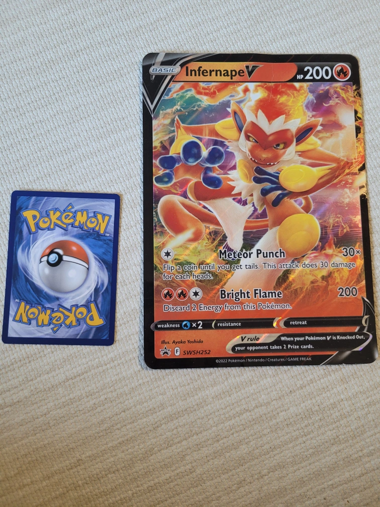 Selling an Infernape V Pokemon card! It has 200 HP and features the Meteor Punch and Bright Flame attacks. It's in great condition and ready for a new home