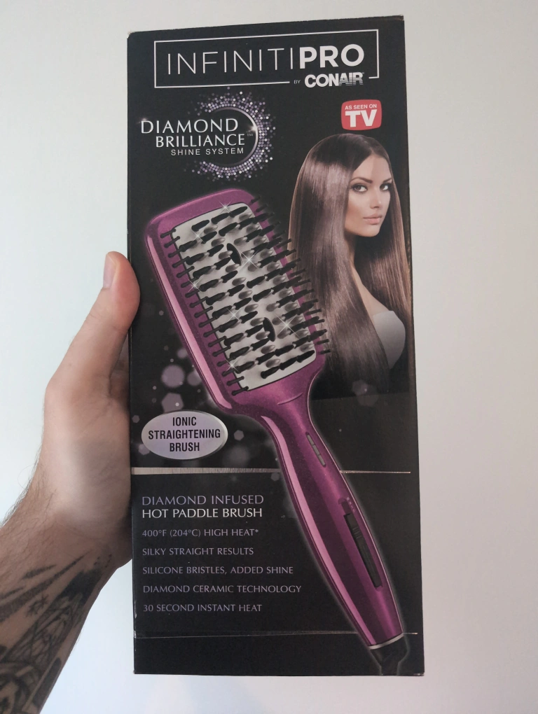 Used once, my wife didnt like it Get silky straight results with this Infiniti Pro by Conair Diamond Brilliance Shine System ionic straightening brush! It features diamond-infused hot paddle brush technology for even heat distribution. It heats up in just 30 seconds and reaches 400°F (204°C). The silicone bristles add shine to your hair