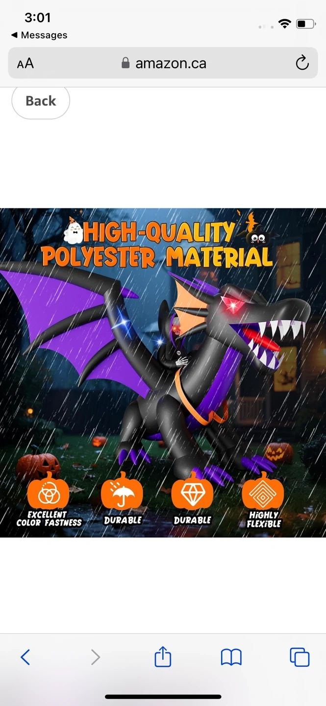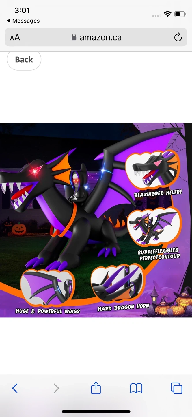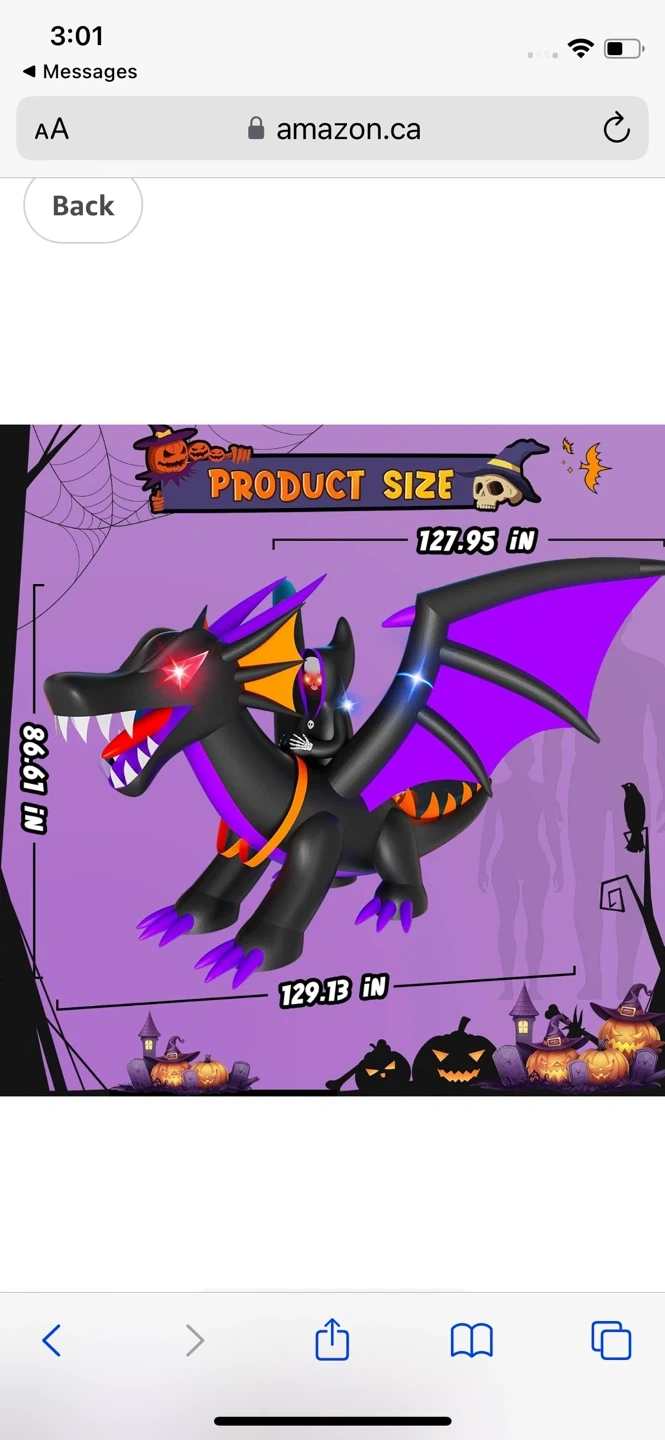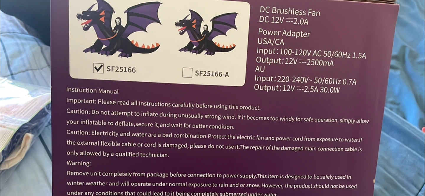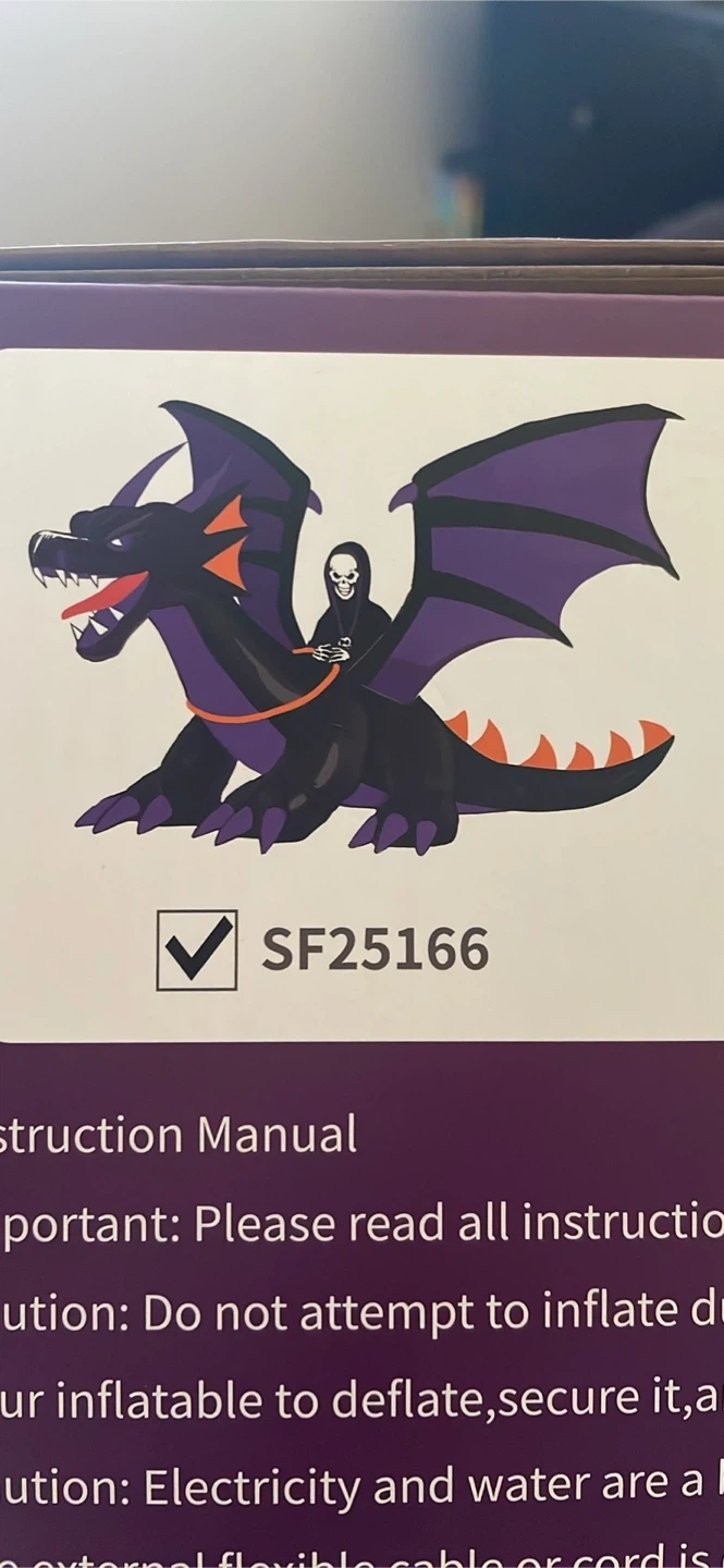 Get ready for Halloween with this inflatable dragon! It features a grim reaper rider and is sure to be a hit with trick-or-treaters. The dragon is black with purple wings and orange accents. It measures approximately 129 inches long and 86 inches high. Made of high-quality polyester material, it's durable and flexible. Includes a DC brushless fan and power adapter. Model SF25166