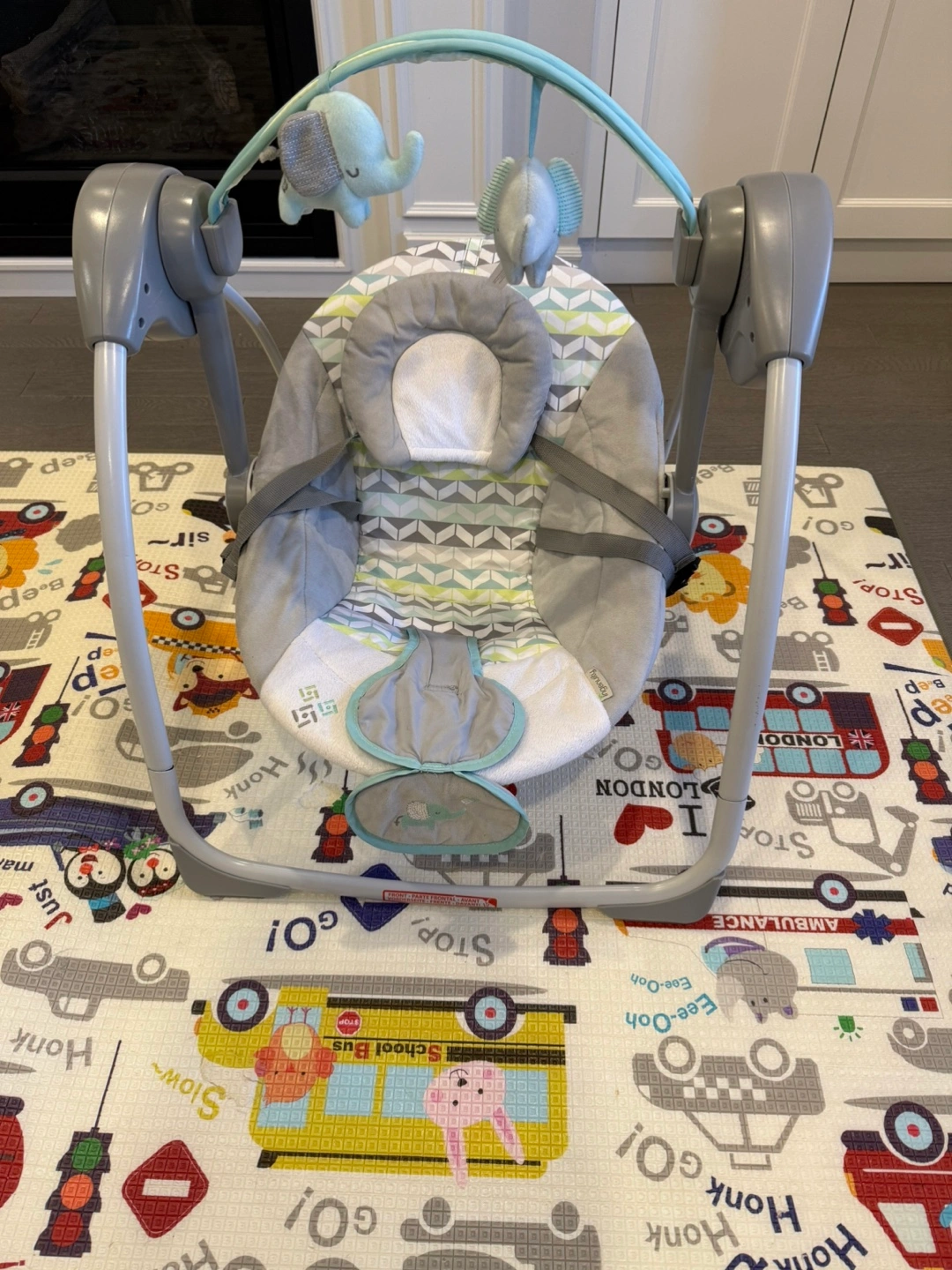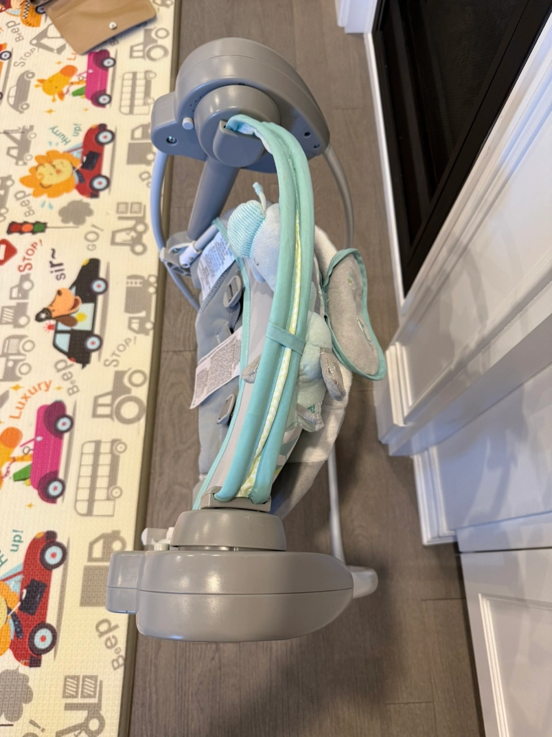Infant swing, grey and teal. Features multiple swing speeds and soothing sounds. Includes hanging toys. Good condition.