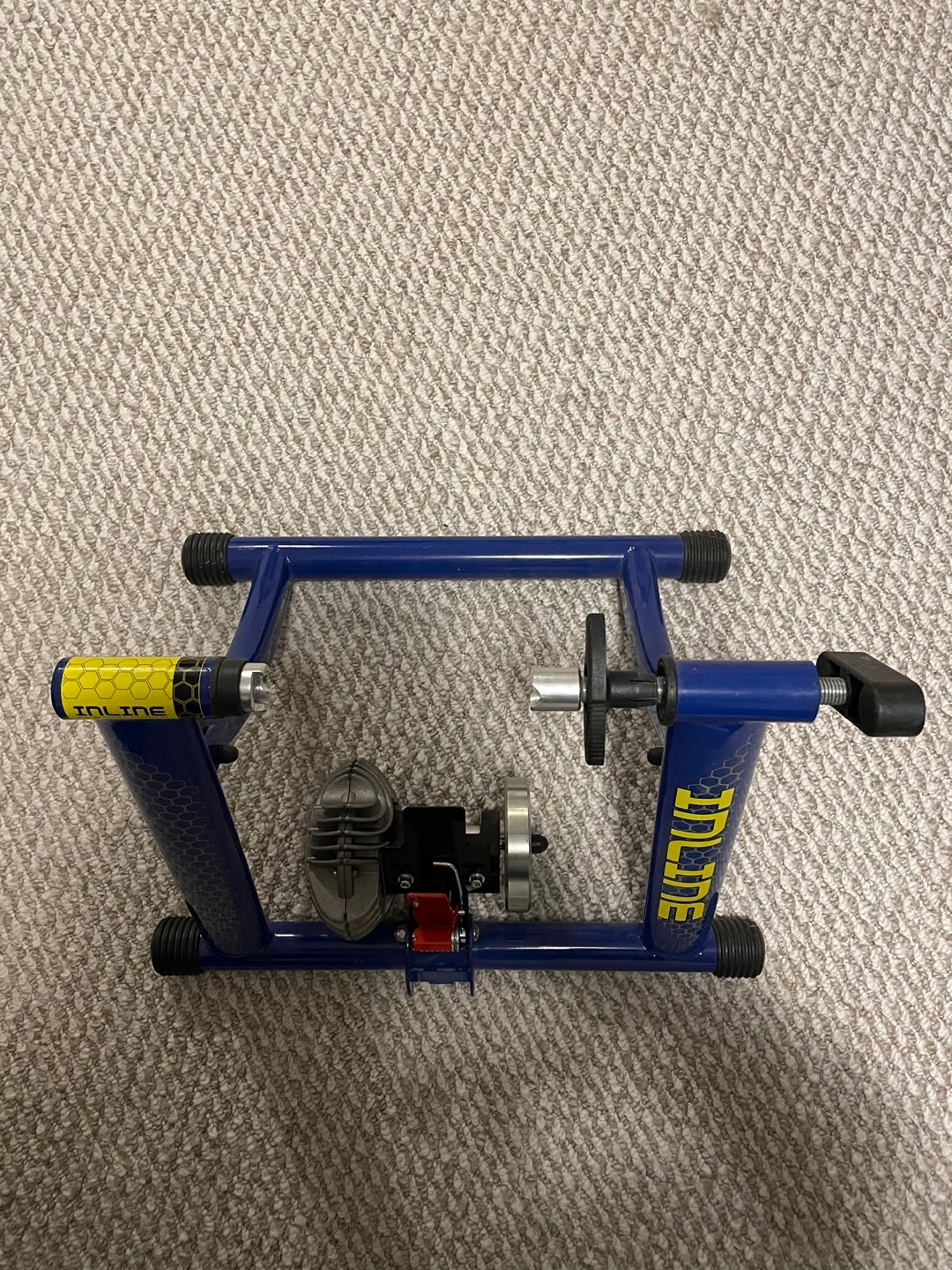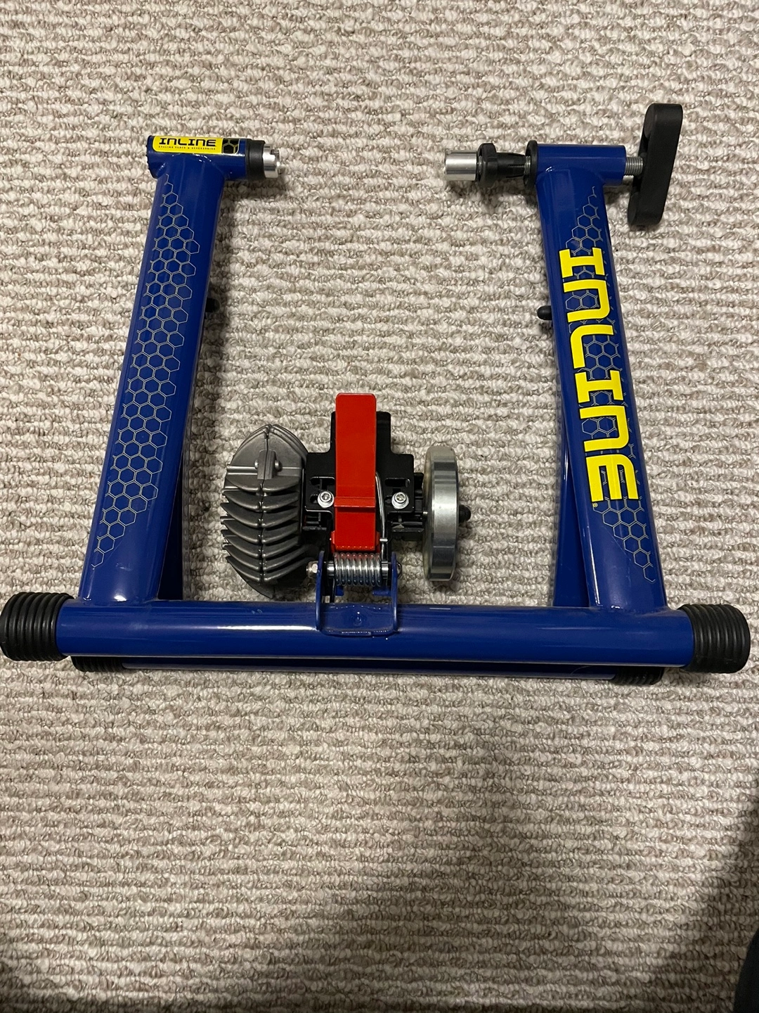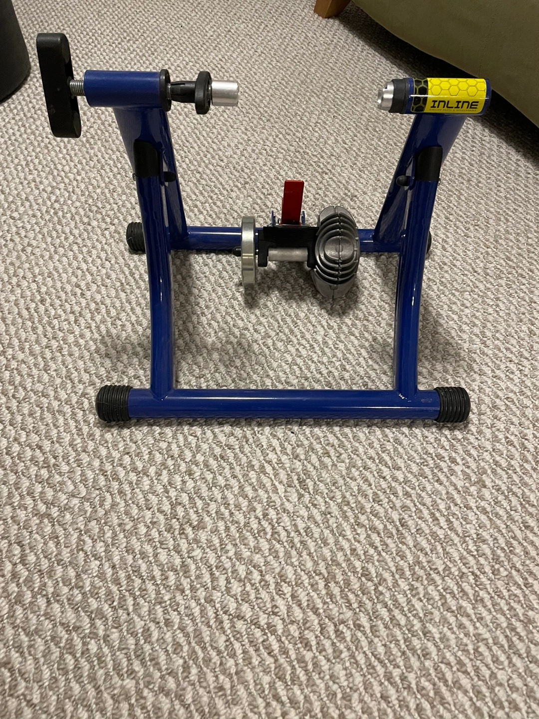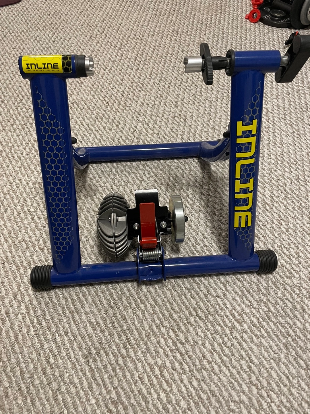 Inline Indoor Bike Trainer (Barely used) 75$ or best offer! Train indoors all year round with the same bike you ride out on the road. Smooth and quiet resistance. Easily folds for storage or transport.