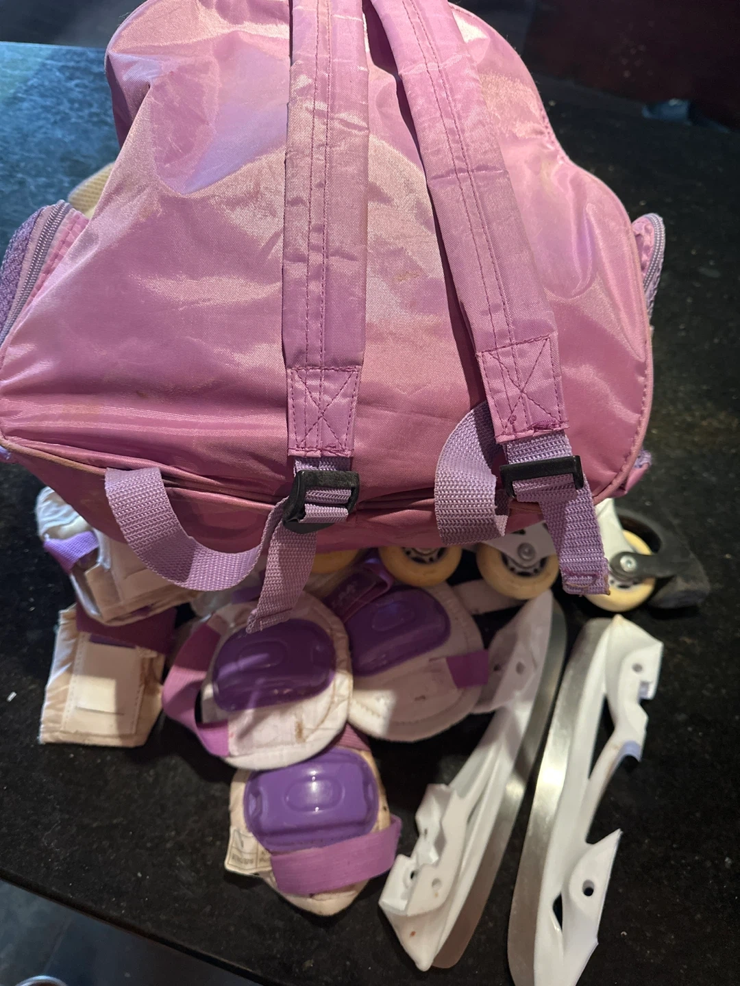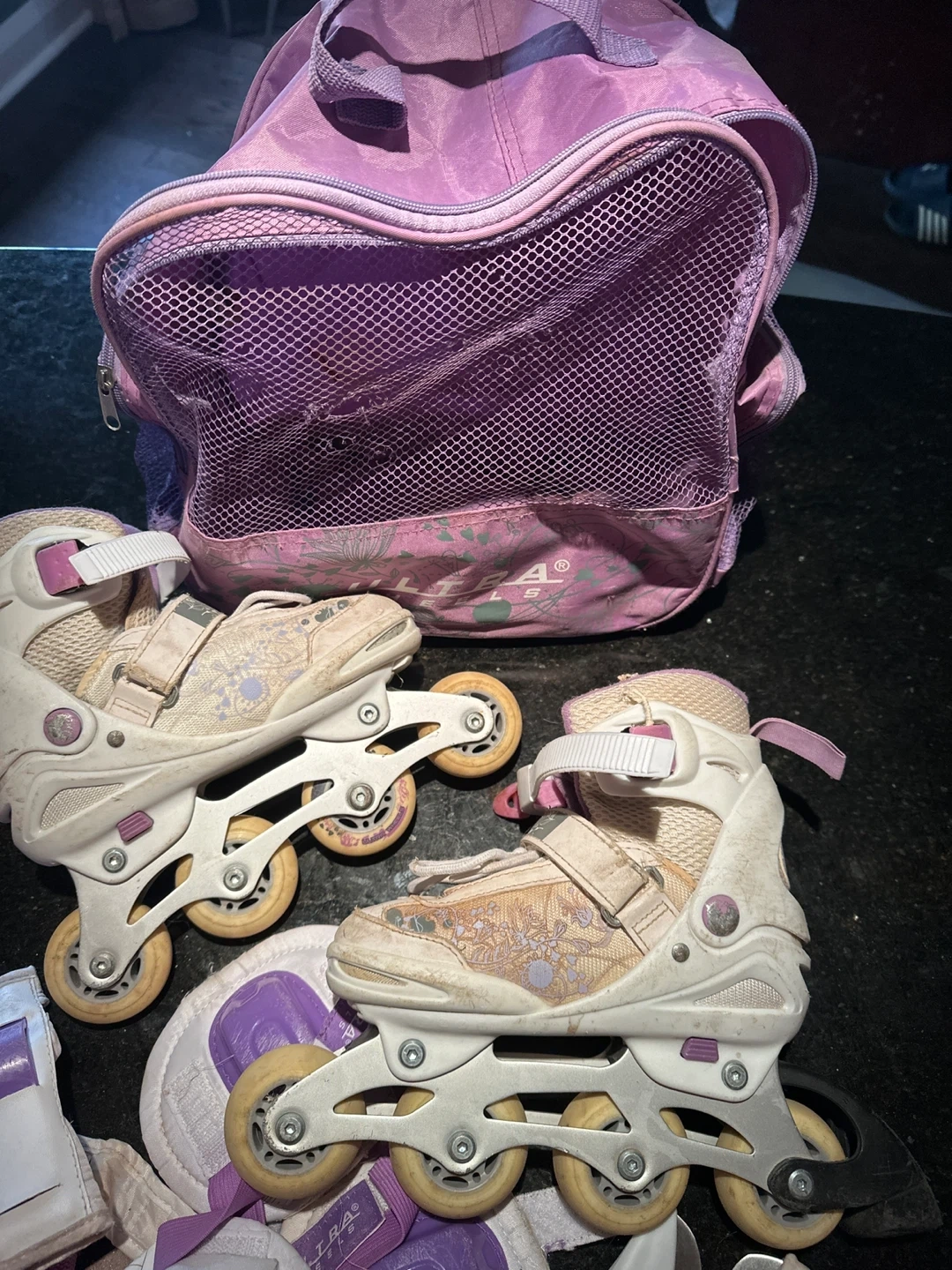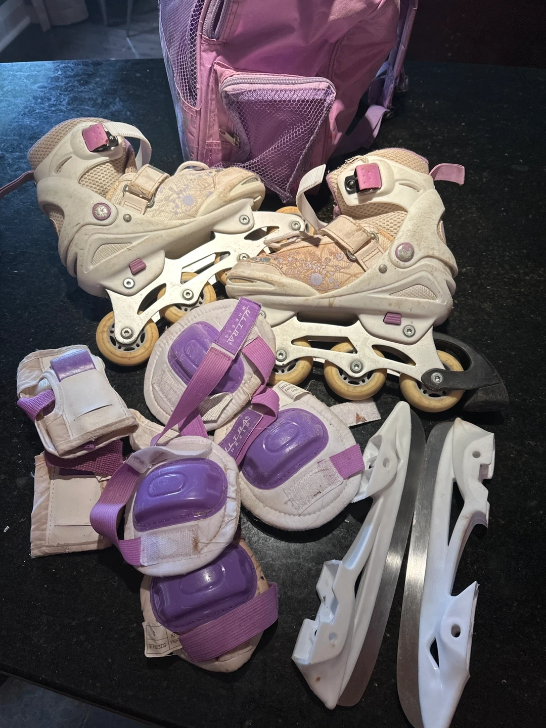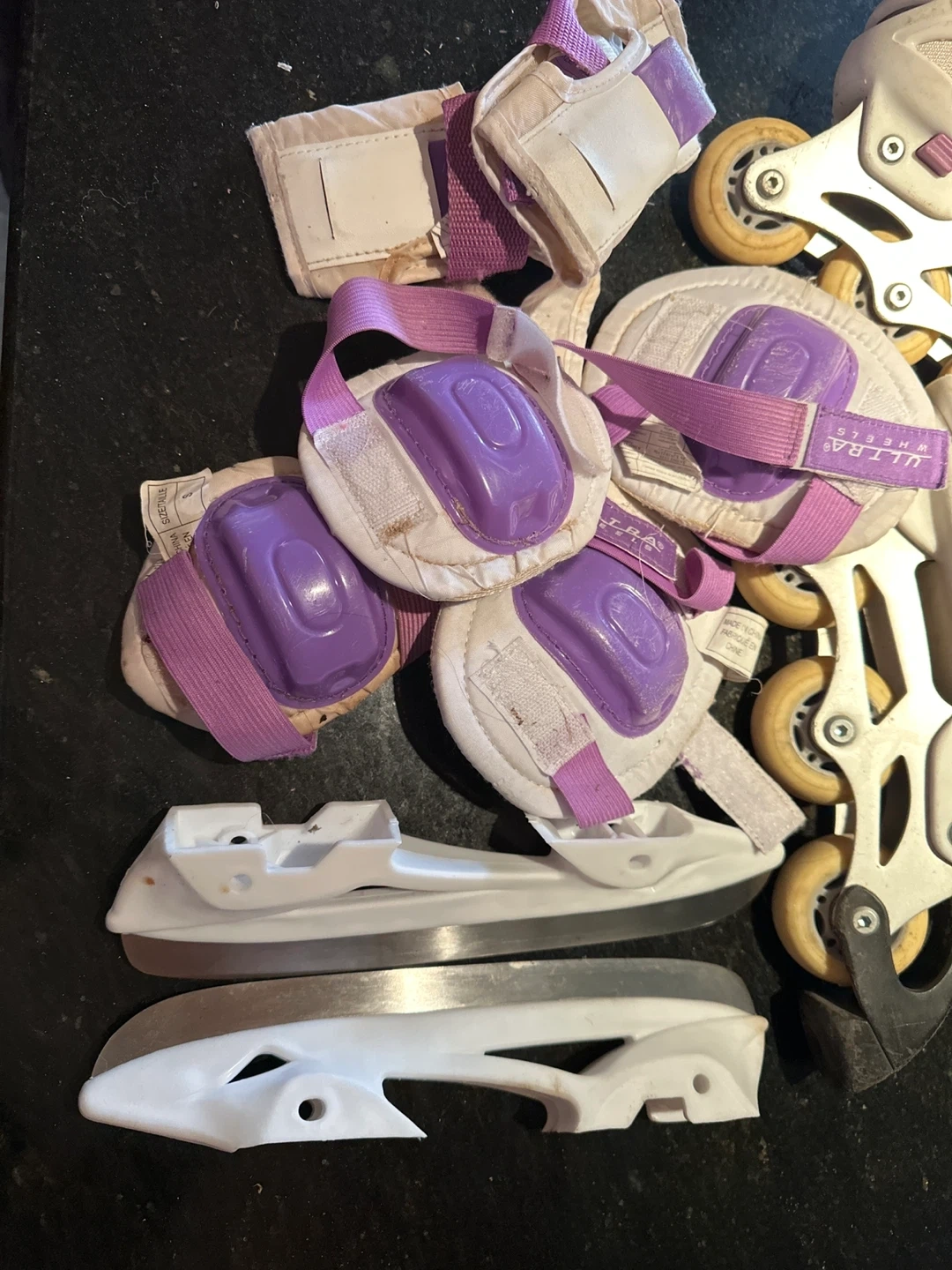 Selling a set of inline skates that come with ice blades, so you can use them year-round! Also included are knee pads, elbow pads, and wrist guards for safety. Comes with a handy carrying bag to keep everything together