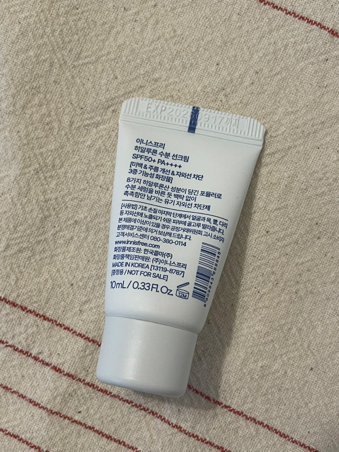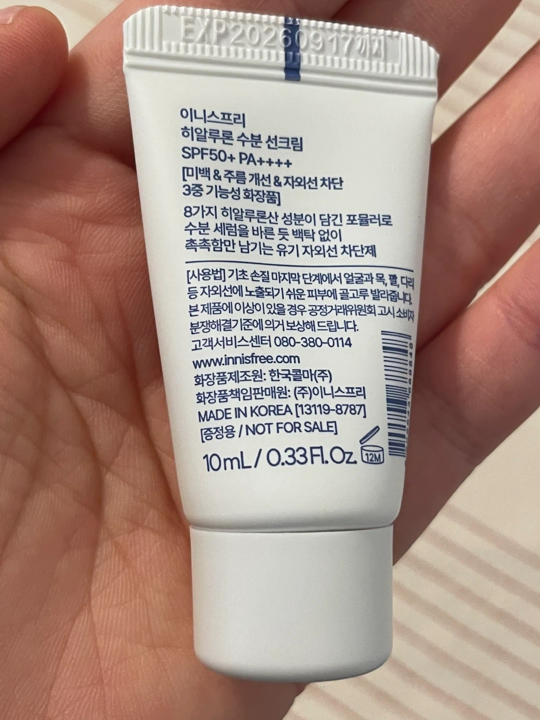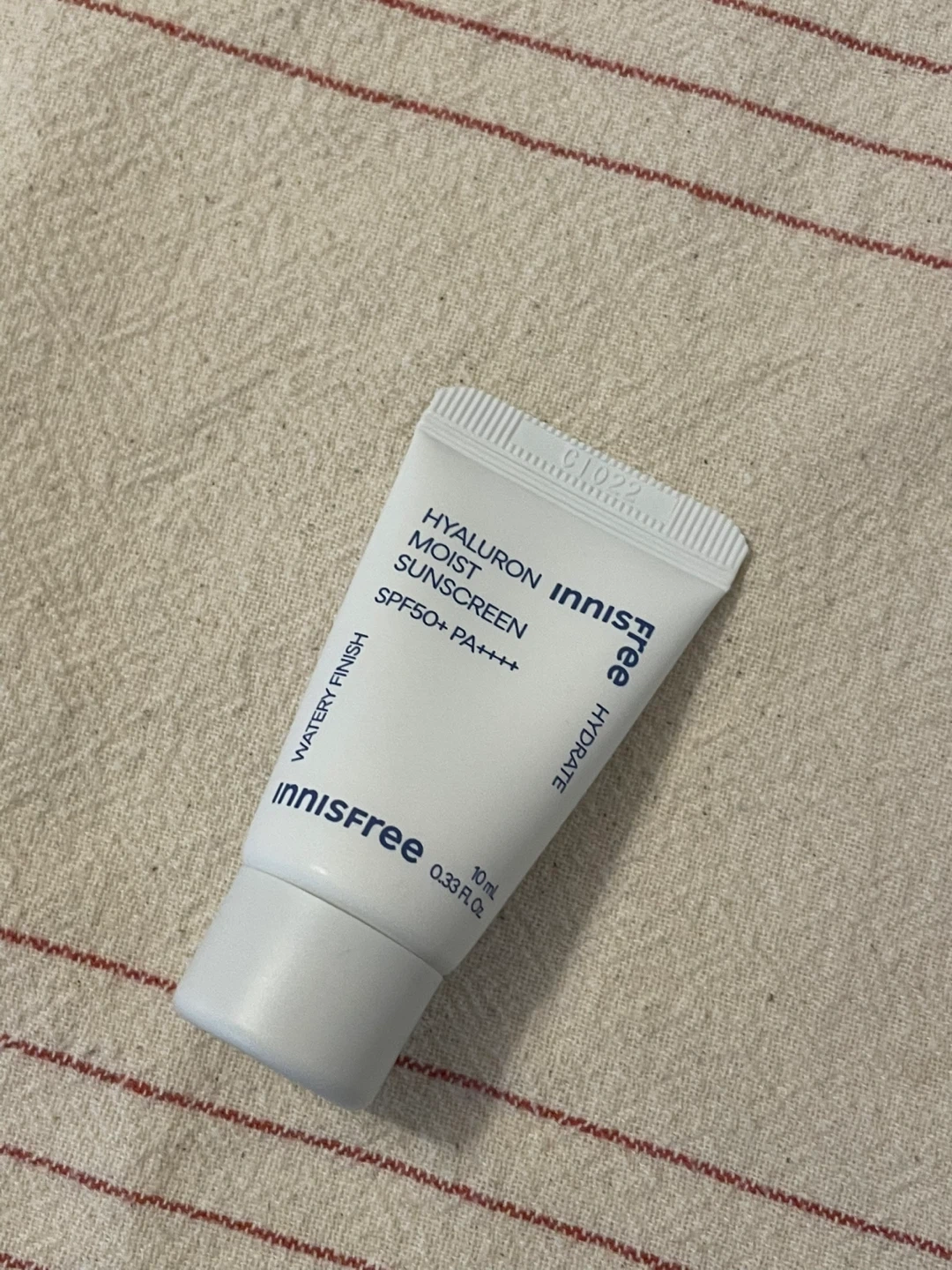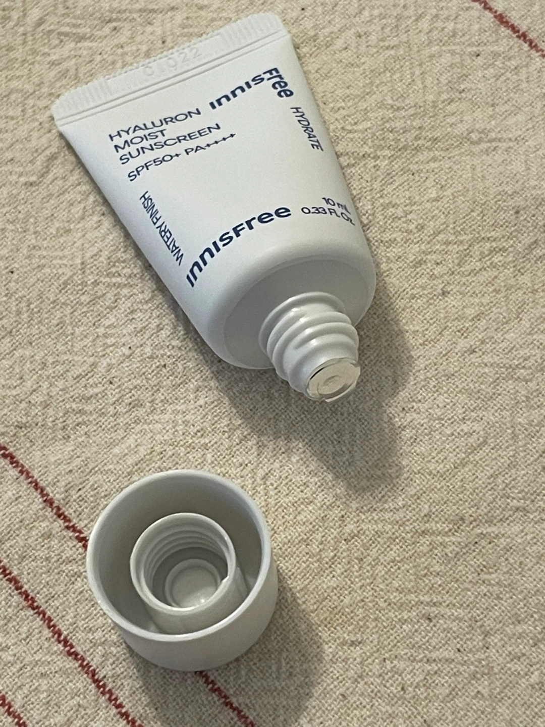 Selling a tube of Innisfree Hyaluron Moist Sunscreen with SPF50+ PA++++. It's a watery finish sunscreen that's perfect for daily use. The size is 10ml / 0.33 fl.oz. Expiry Date: 2026 September 17