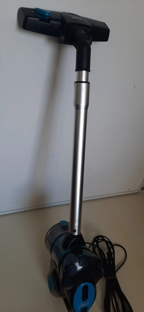 Corded handheld vacuum, blue and black. Has a telescopic wand and multiple attachments.