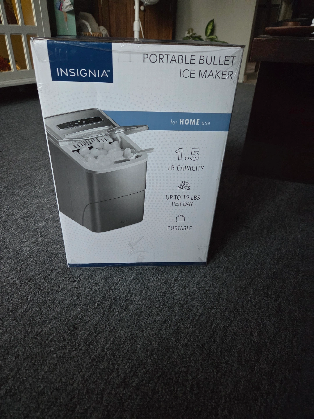 Keep your favourite beverages ice-cold with this Insignia portable bullet ice maker! It's in excellent condition and comes with the original box. It makes up to 19 lbs (8.62 kg) of ice per day and the water recycling system saves water. Compact design fits nicely on countertops. Perfect for parties or everyday use! Brand new box never opened.