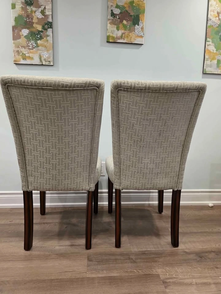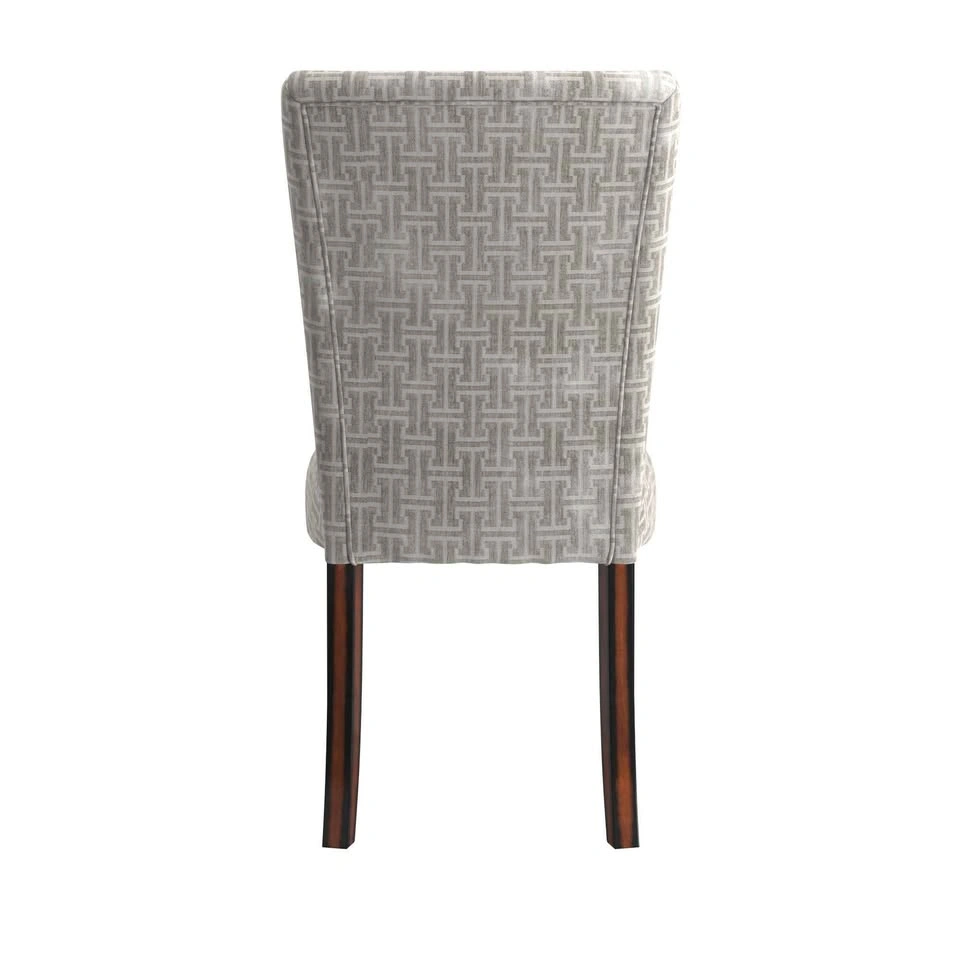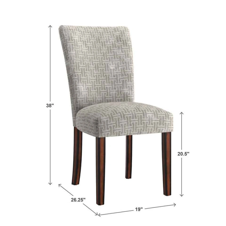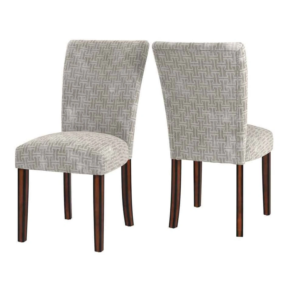 Stylish and comfortable dining chairs with espresso-finish legs and gray bracket chain print fabric. Timeless Parsons design perfect for dining rooms, kitchens, or accent seating. Sturdy wood frame with padded cushioned seats for comfort. Current retail: $524.99 for a set of 2 (see last photo) Brand new, comes in original box with assembly instructions Easy to assemble, all hardware included Neutral design matches most interiors Pulled from a liquidation pallet