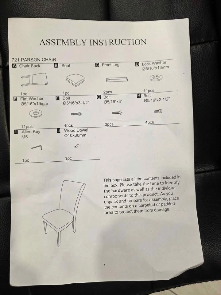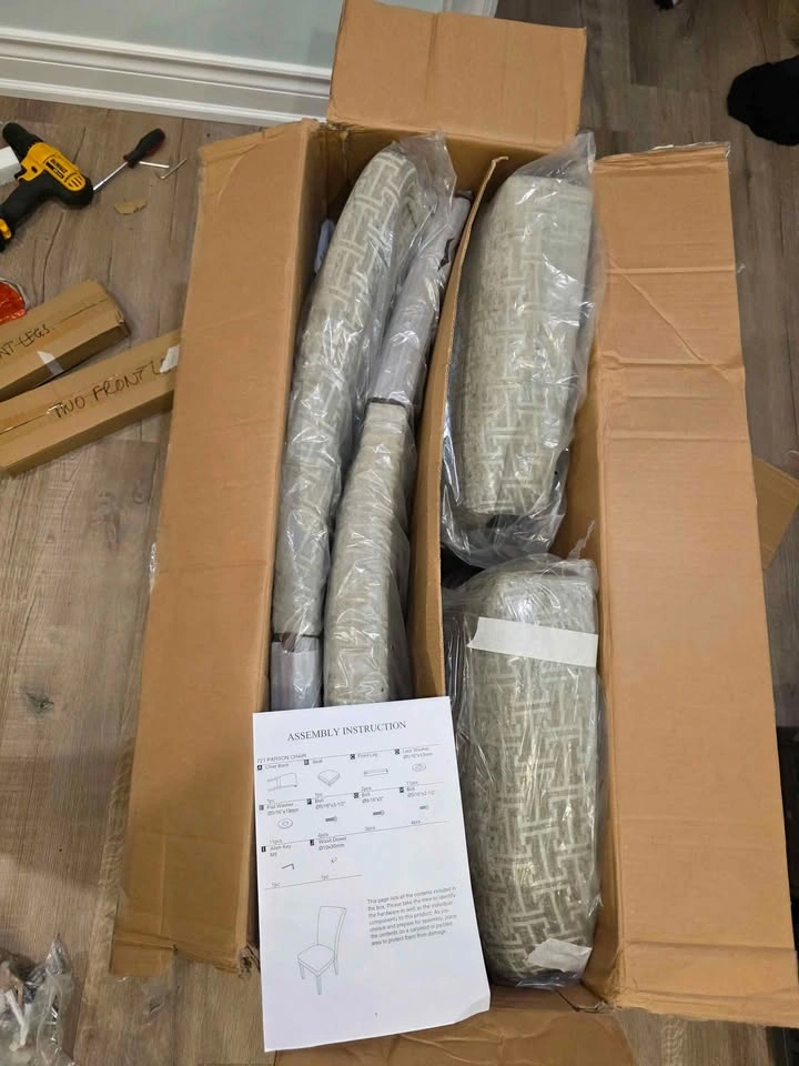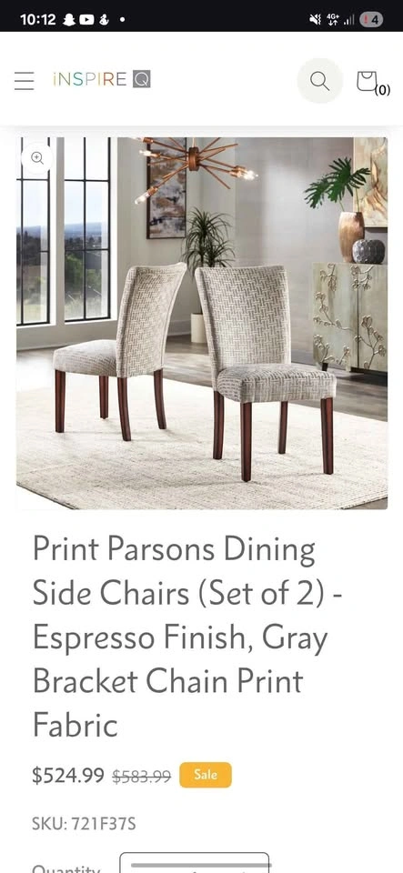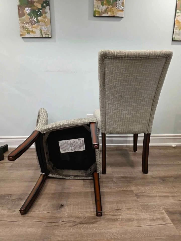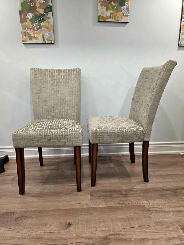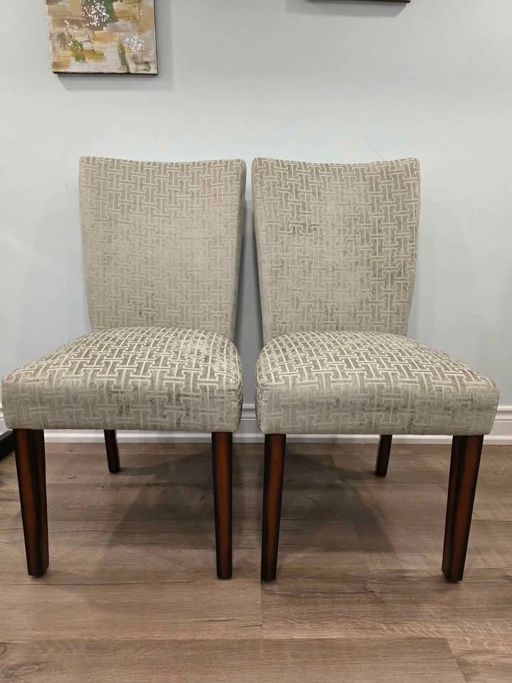 Stylish and comfortable dining chairs with espresso-finish legs and gray bracket chain print fabric. Timeless Parsons design perfect for dining rooms, kitchens, or accent seating. Sturdy wood frame with padded cushioned seats for comfort. Current retail: $524.99 for a set of 2 (see last photo) Brand new, comes in original box with assembly instructions Easy to assemble, all hardware included Neutral design matches most interiors Pulled from a liquidation pallet