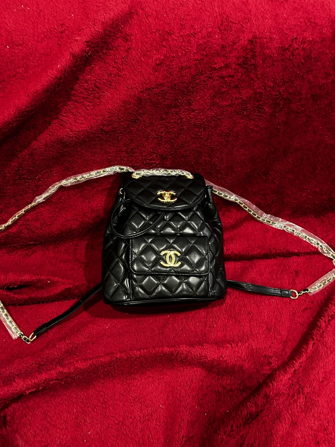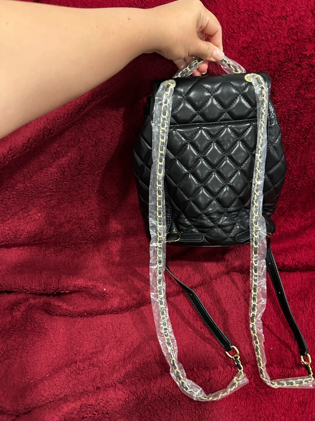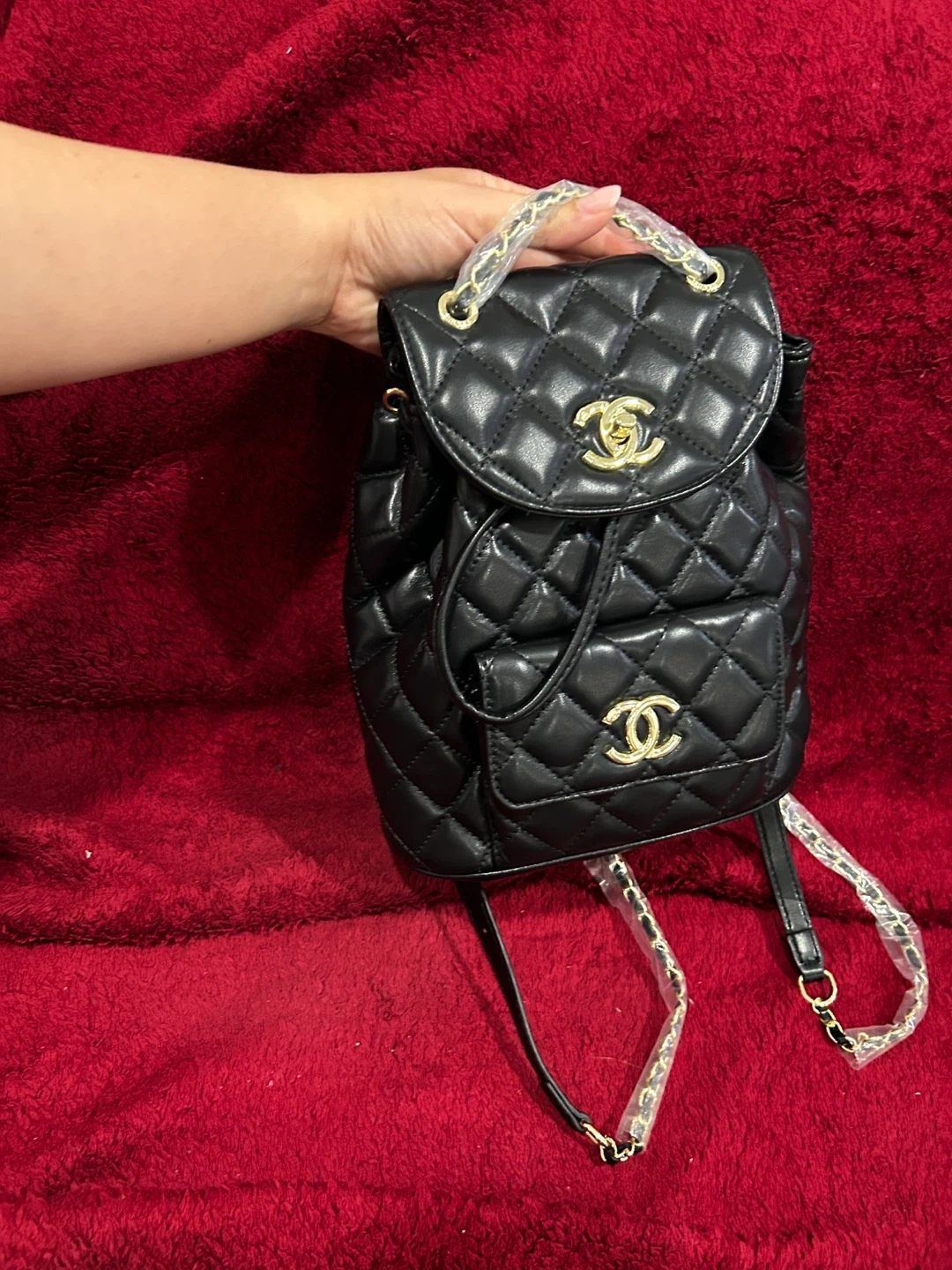 Selling an inspired stylish Chanel black quilted leather backpack. It features the iconic Chanel logo and a chic chain strap. This backpack is perfect for adding a touch of luxury to your everyday look!