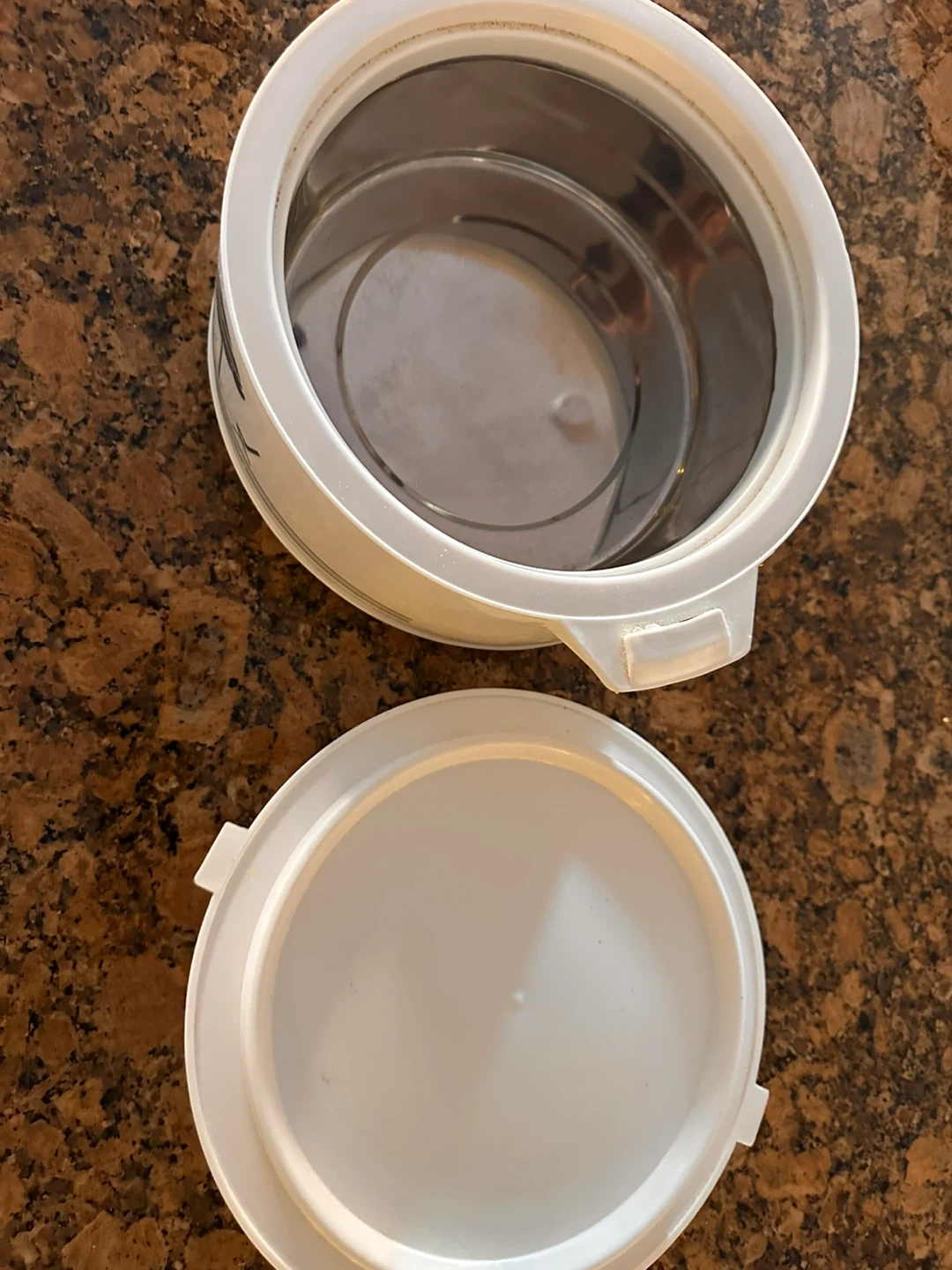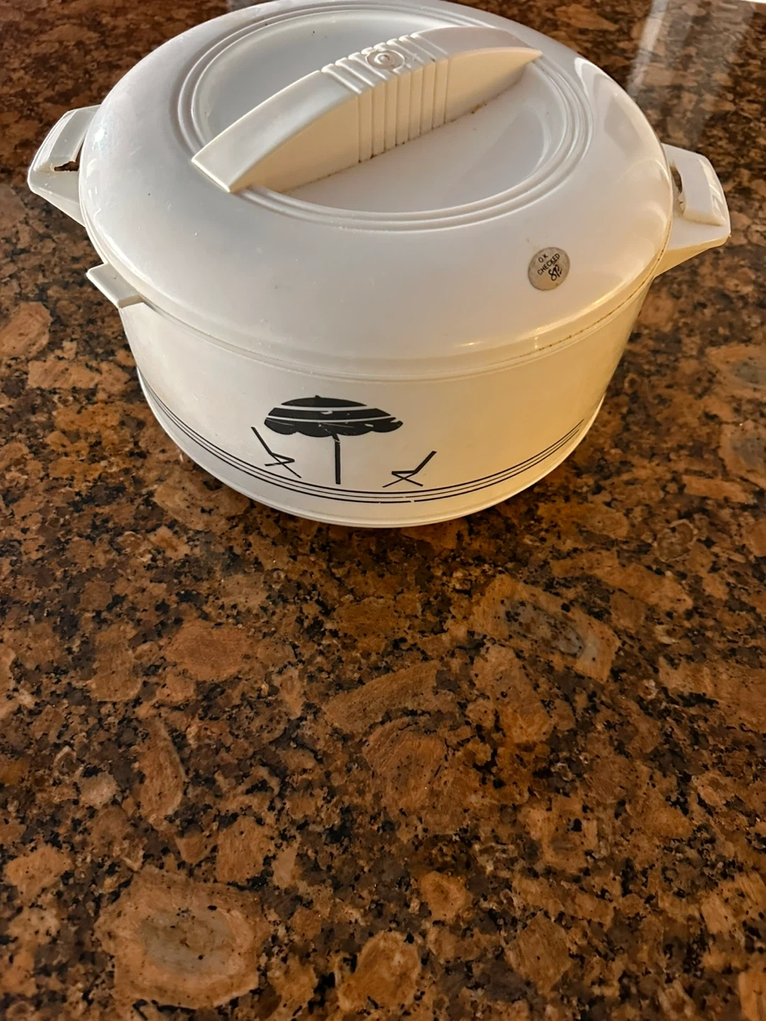 Selling an insulated casserole dish with a cute beach-themed design! It's perfect for keeping your food warm at potlucks or family gatherings. The dish comes with a lid to help maintain the temperature. It's in great condition and ready for a new home