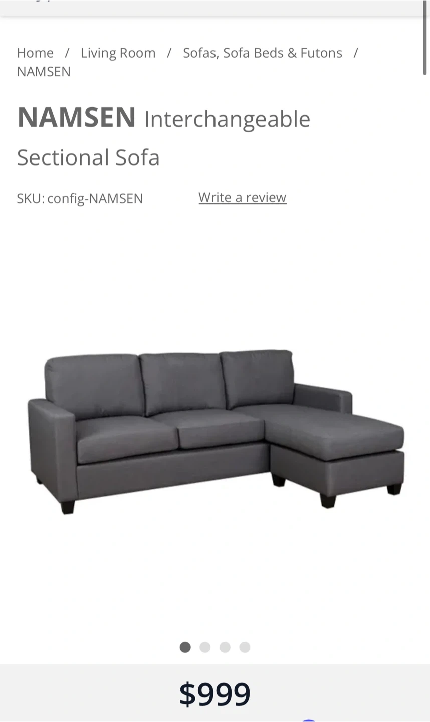 Are you in need of a Comfortable and stylish grey fabric sectional sofa, perfect for adding a touch of modern elegance to your living room. Look no further! I’m selling a bra sofa that has barely been used and is in excellent condition. Features three cushioned seats and a chaise lounge. Dimensions are approximately 221 cm (87") long, 149 cm (58.7") wide and 90 cm (35.4") high. I’m moving out and need to find this gem a new home! It’s perfect for any living space. Seriously inquiries only! Pick up only, easy for pick up as it is foldable . Don’t miss this fantastic deal! Its original price is 999$ (see link below ) selling it for 400$. https://www.jysk.ca/namsen-interchangeable-sectional-sofa.html