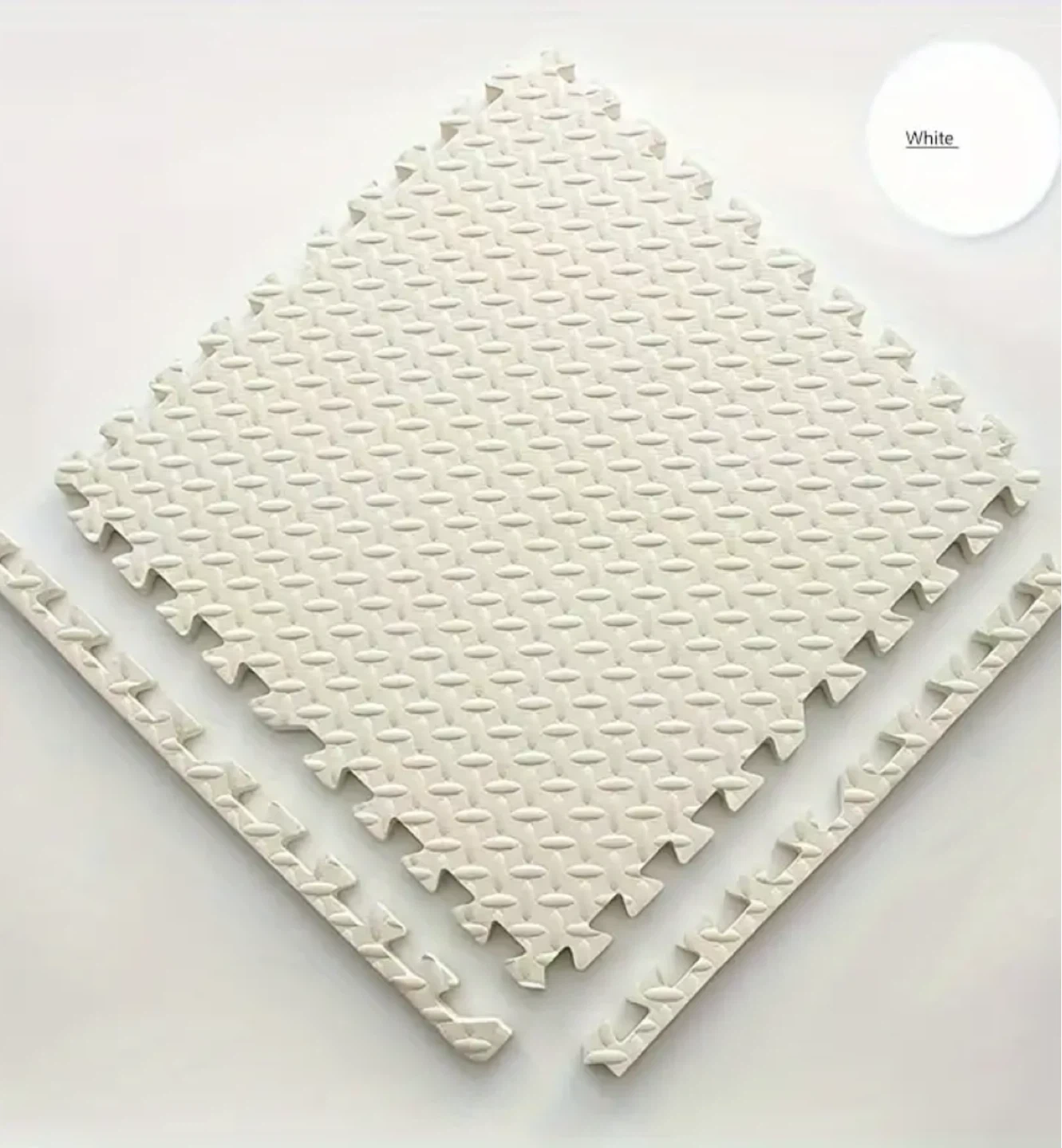 Interlocking foam play mat tiles, perfect for creating a safe and comfortable play area for kids. Each tile measures 30cm x 30cm (11.81 inches). They're easy to assemble. White colour only (blue one is to show their size)