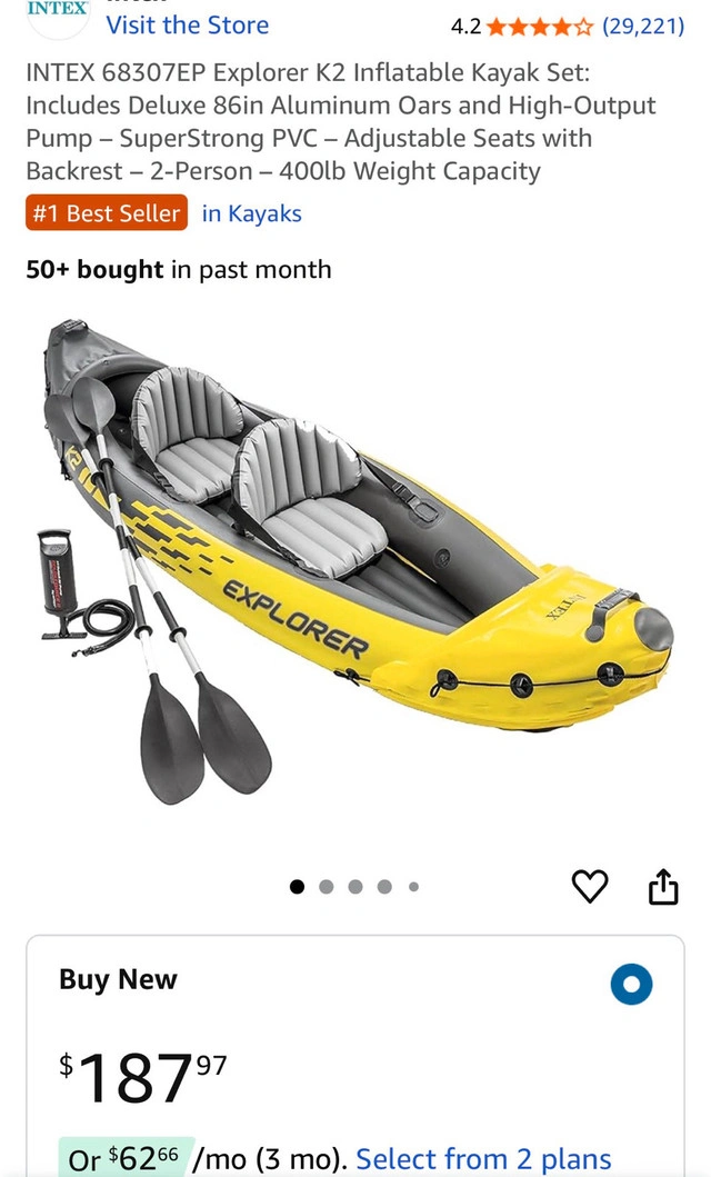 Get ready for fun with this Intex 68307EP Explorer K2 Inflatable Kayak Set, which includes deluxe 86in aluminum oars, a high-output pump, and is constructed from SuperStrong PVC, featuring adjustable seats with backrests and a 400lb weight capacity. Key features include: * Deluxe 86in Aluminum Oars * High-Output Pump * SuperStrong PVC Construction * Adjustable Seats with Backrest * 2-Person Capacity * 400lb Weight Capacity. If the ad is up, the kayak is ready!