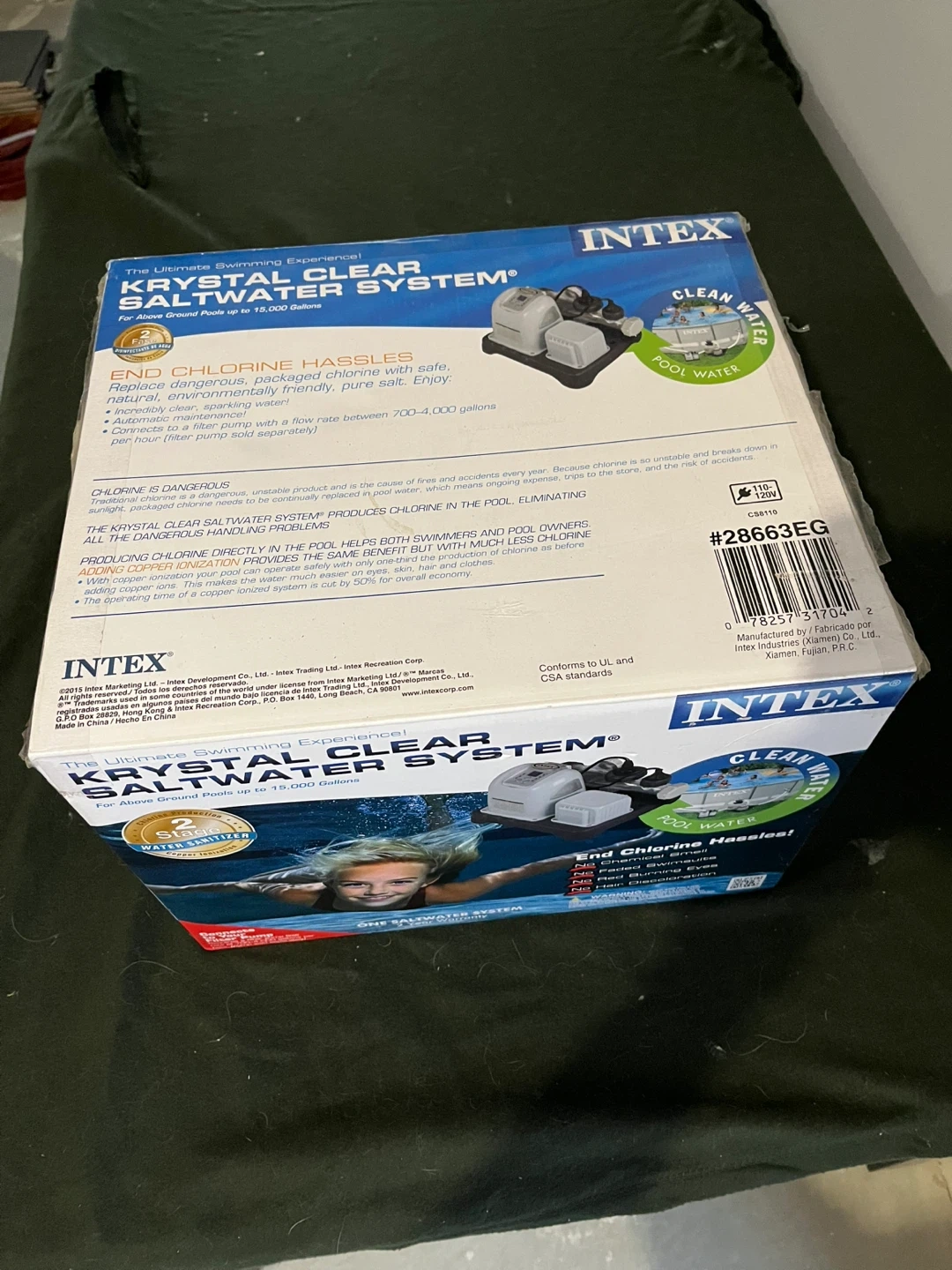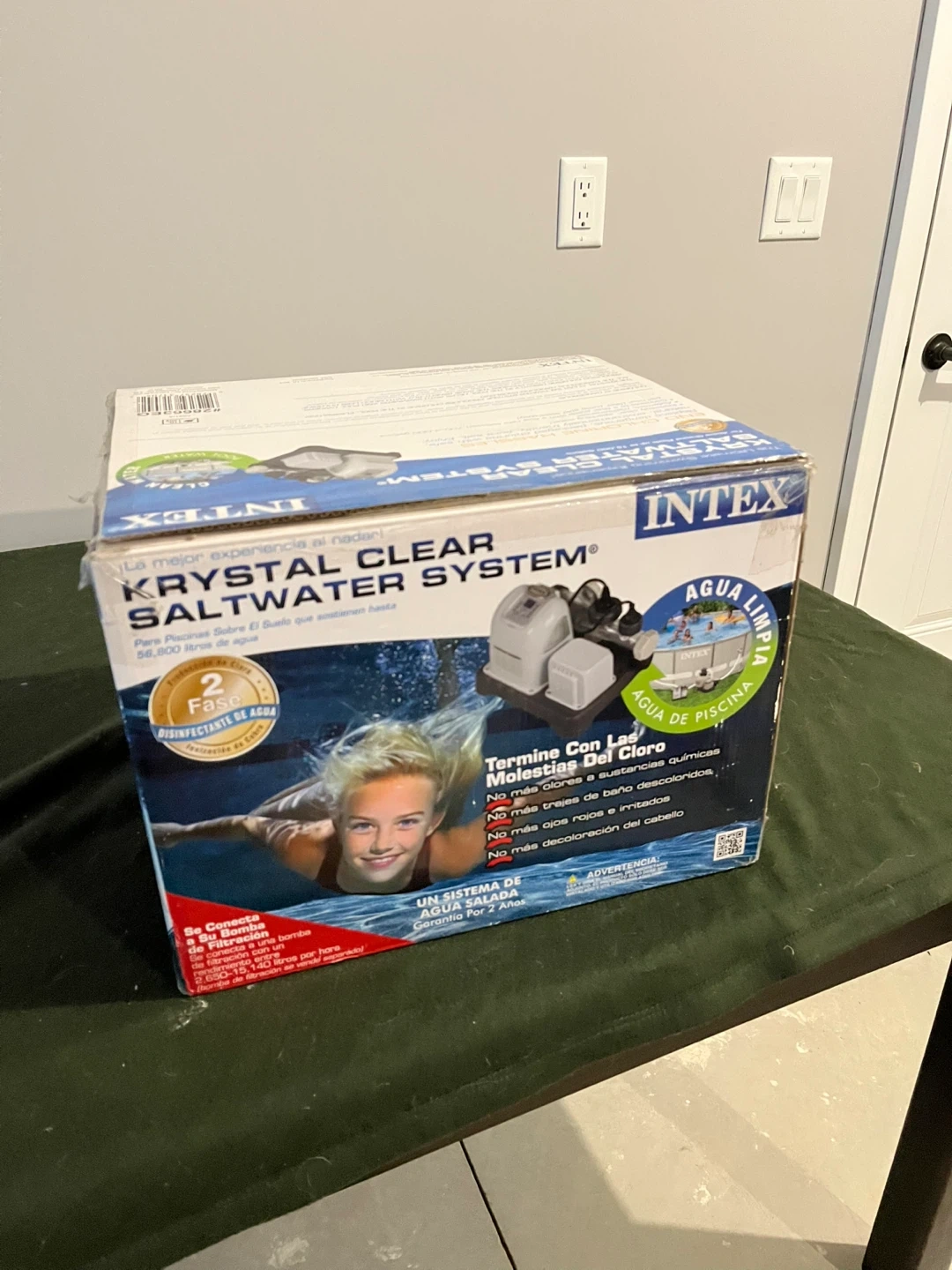 Selling an Intex Krystal Clear Saltwater System! This is the ultimate swimming experience for above-ground pools up to 15,000 gallons. It's designed to end chlorine hassles and provide sparkling, safe pool water. Enjoy a hassle-free, clean pool!