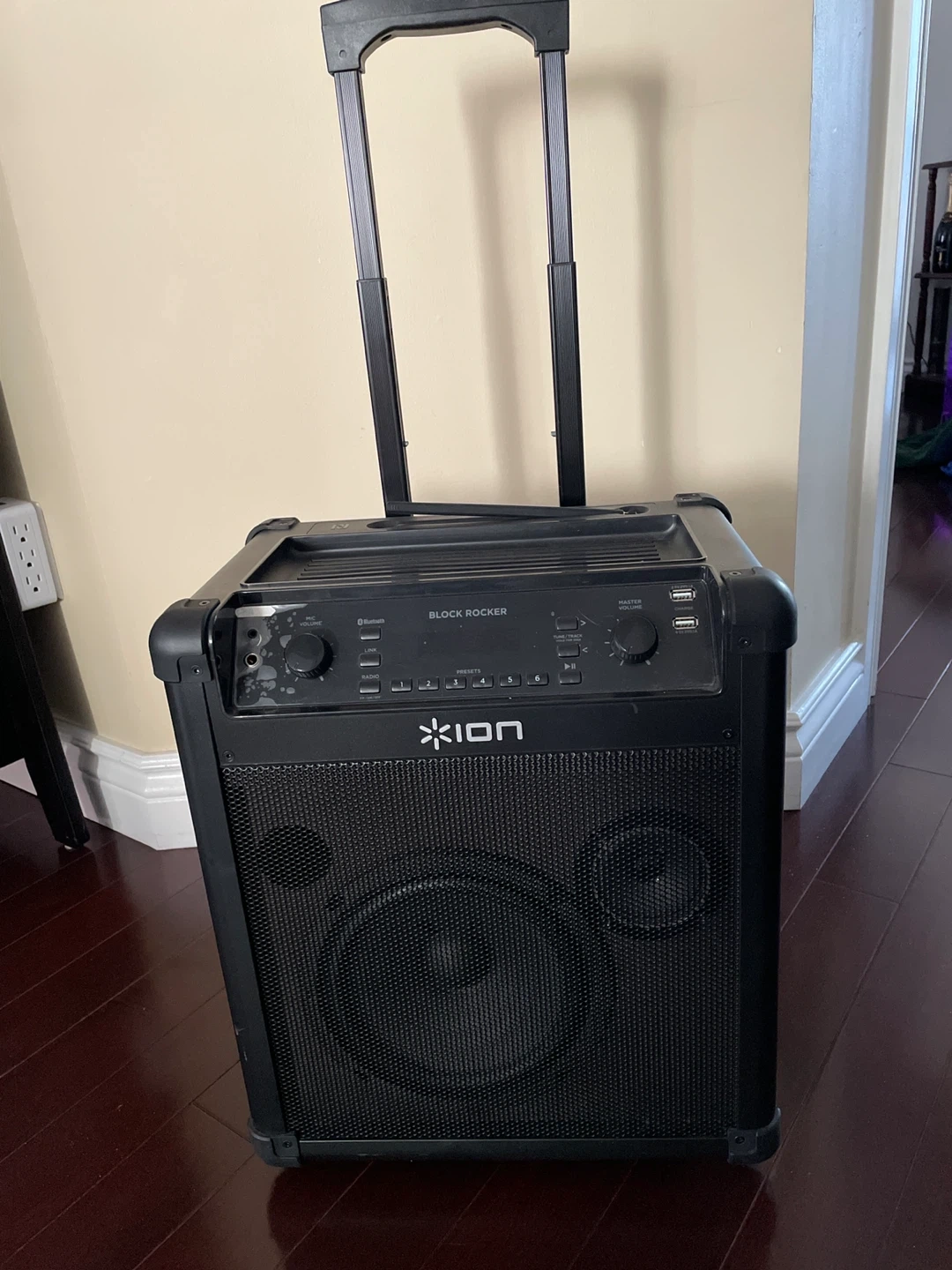 Selling an ION Block Rocker portable speaker. It has a telescoping handle and wheels for easy transport. Perfect for parties or events! Needs battery replaced.
