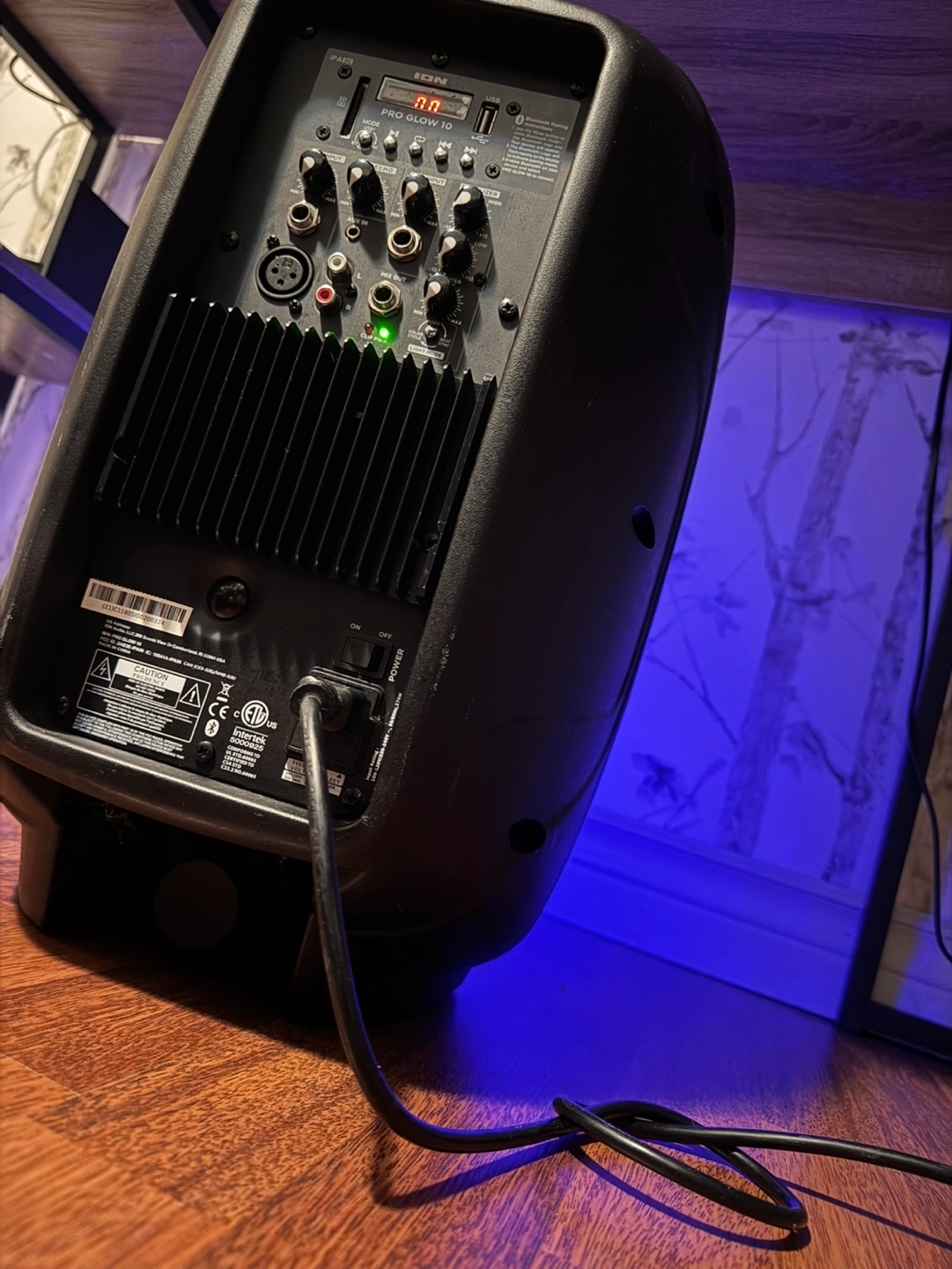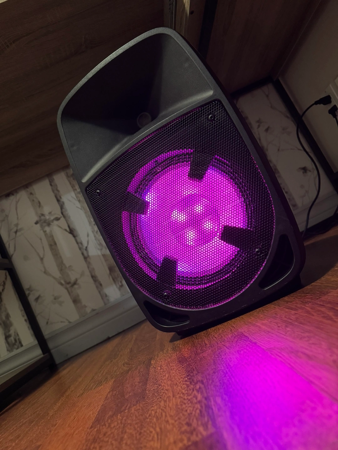 Black portable speaker with LED lights. Includes power cord.
