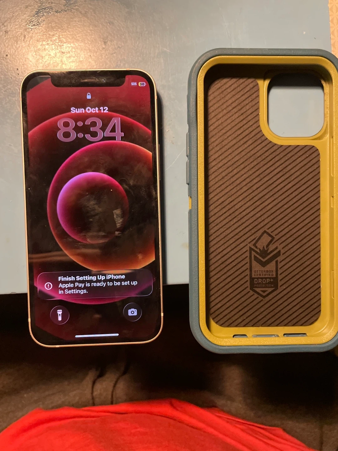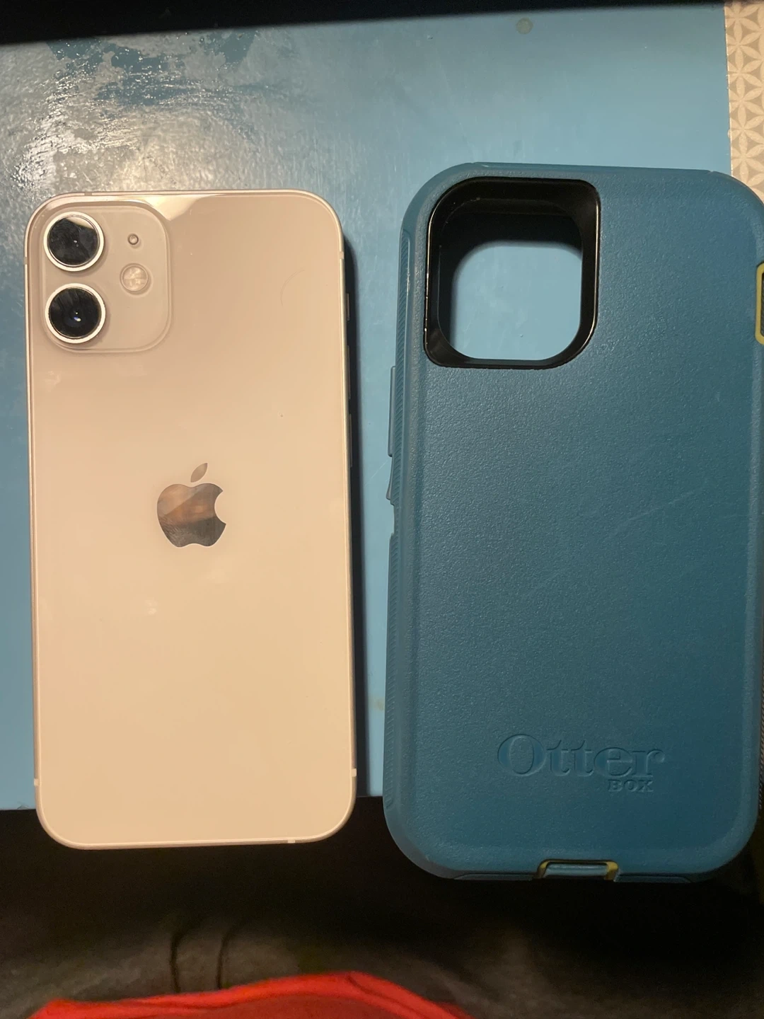 iPhone 12 mini in white with otter box heavy duty case, excellent condition, 85% battery health