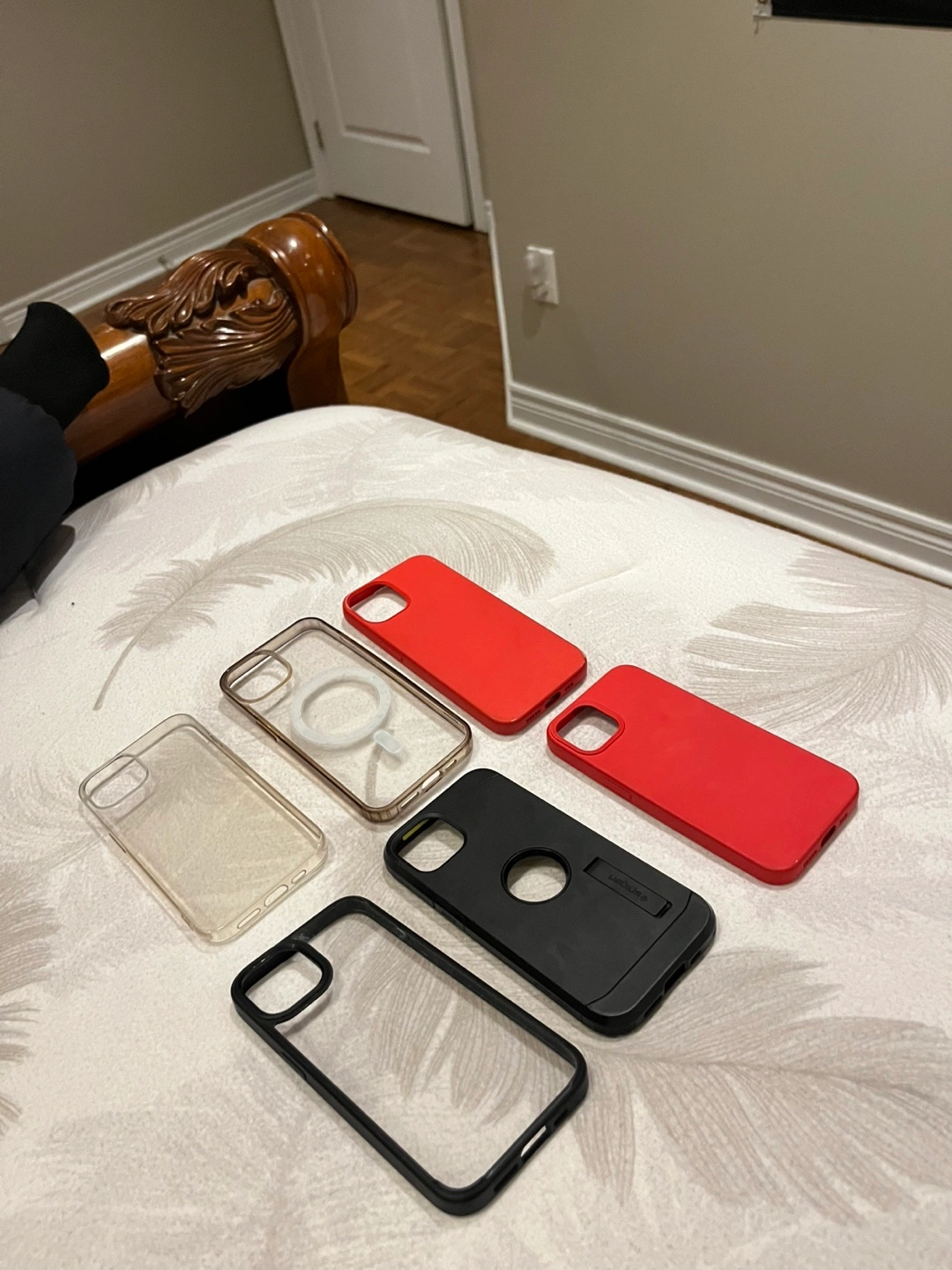 Five iPhone 13 cases. Two red, two clear, one black, and one clear with black outline. Various styles and materials. Good condition all of them. $10 for all.