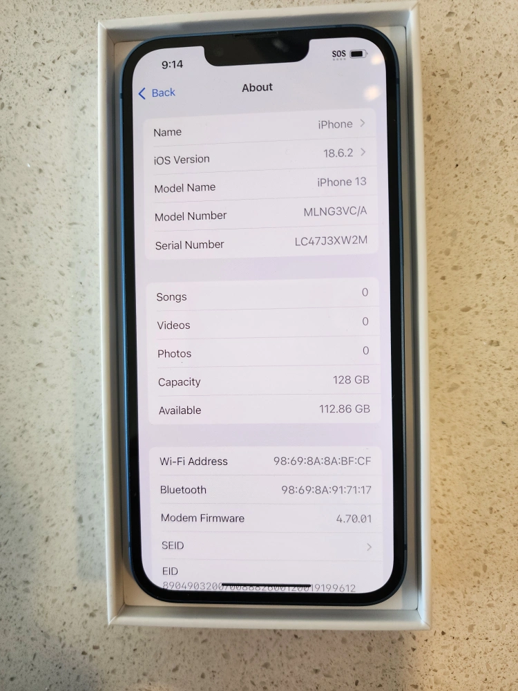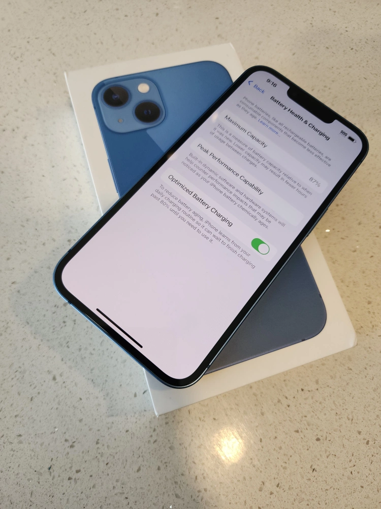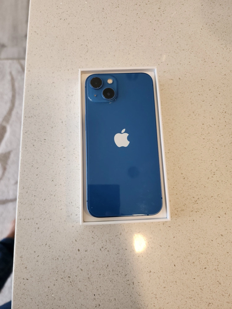 Selling an iPhone 13 in blue with 128GB of storage. It's in great condition and comes with the original box. The battery health is at 87%. Feel free to reach out if you're interested! Free screen protector and delivery within Edmonton