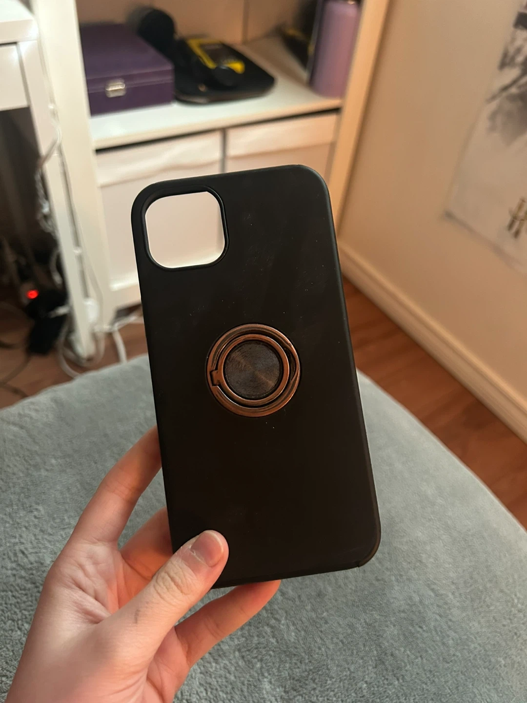 Selling a Phone Case for an iPhone 14. It has a plate on the outside for use with magnetic car holders. Theres also a ring stand on the back for easy holding.