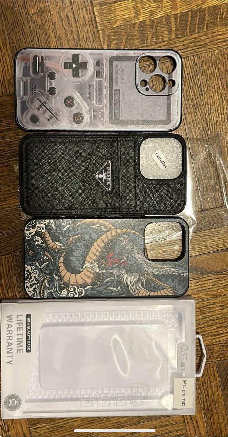 Selling three unique phone cases for the iPhone 14 Pro Max! There's a Prada case Completely new, a Gameboy-themed case mildly used and one with a cool dragon design mildly used.All in great condition and ready for a new home