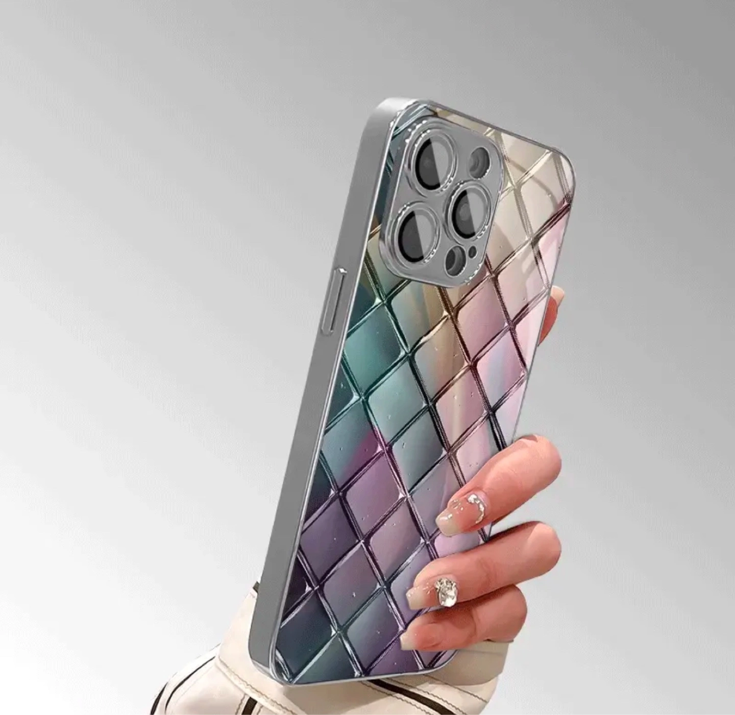 Beautiful phone case. Iridescent diamond pattern. Silver coloured trim. Compatible with iPhone 13 Pro Max. Provides protection for your phone.