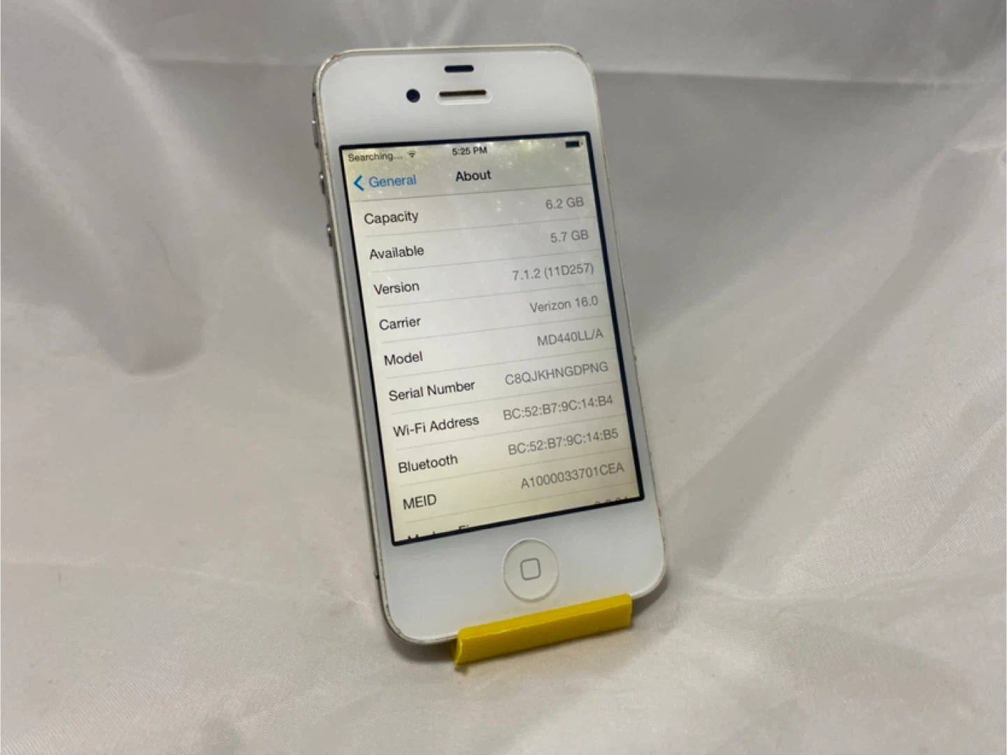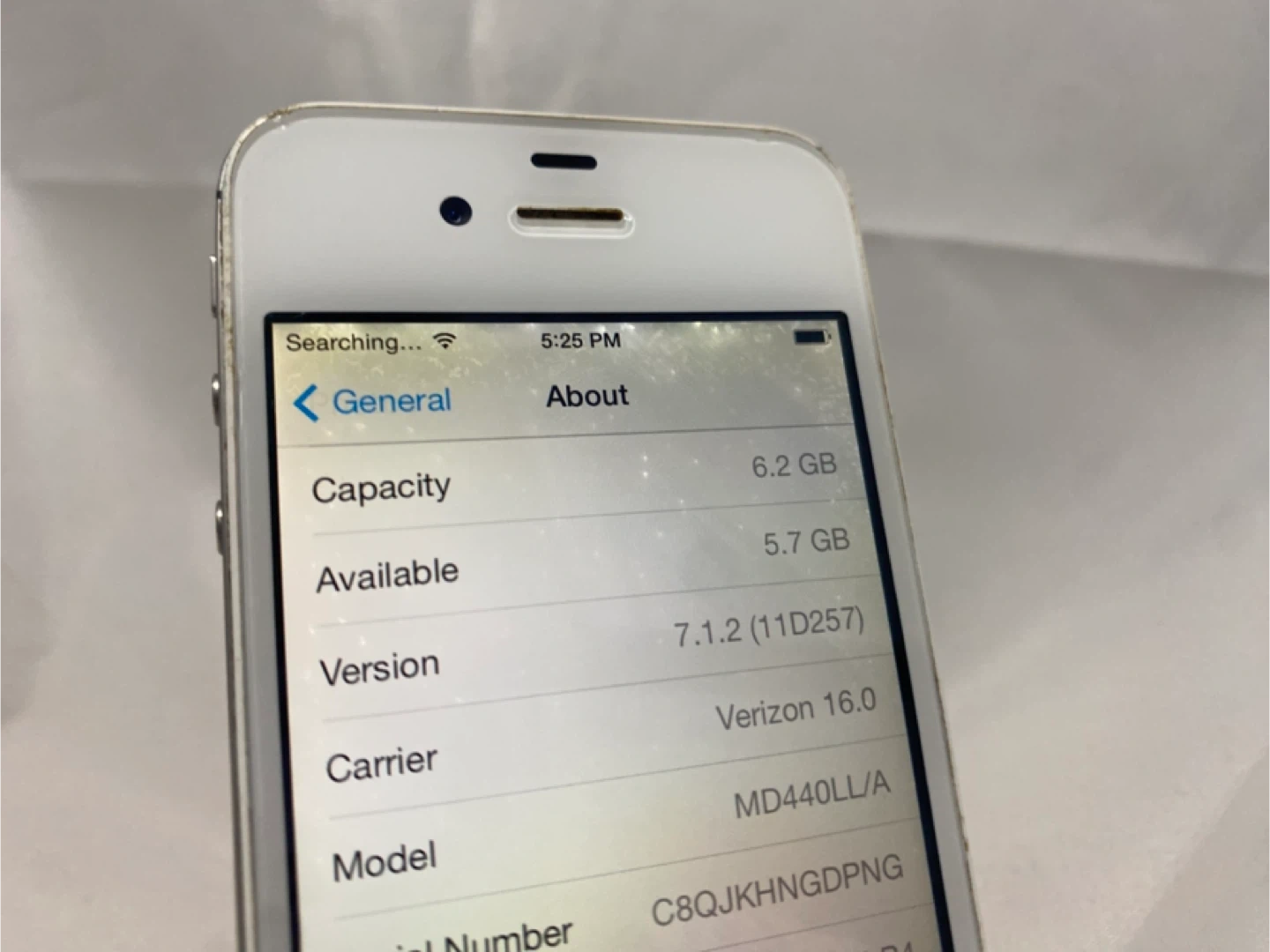 Discover the sleek and classic design of the iPhone 4 in a fresh white color, model A1349, brought to you by Apple. This device operates on iOS 7.1.2 and offers a storage capacity of 8GB, perfect for keeping your essential apps and media on hand. Its bar style is both compact and comfortable to hold, making it an ideal choice for daily use or as a reliable backup phone. Designed for Verizon customers, this iPhone 4 ensures compatibility with CDMA networks. Despite its cracks on the back and screen dots, this device maintains its functionality, offering a clear display and responsive touch for a smooth user experience. The model number A1349 (CDMA) confirms its authenticity and ensures you're getting the quality and performance you expect from Apple.
