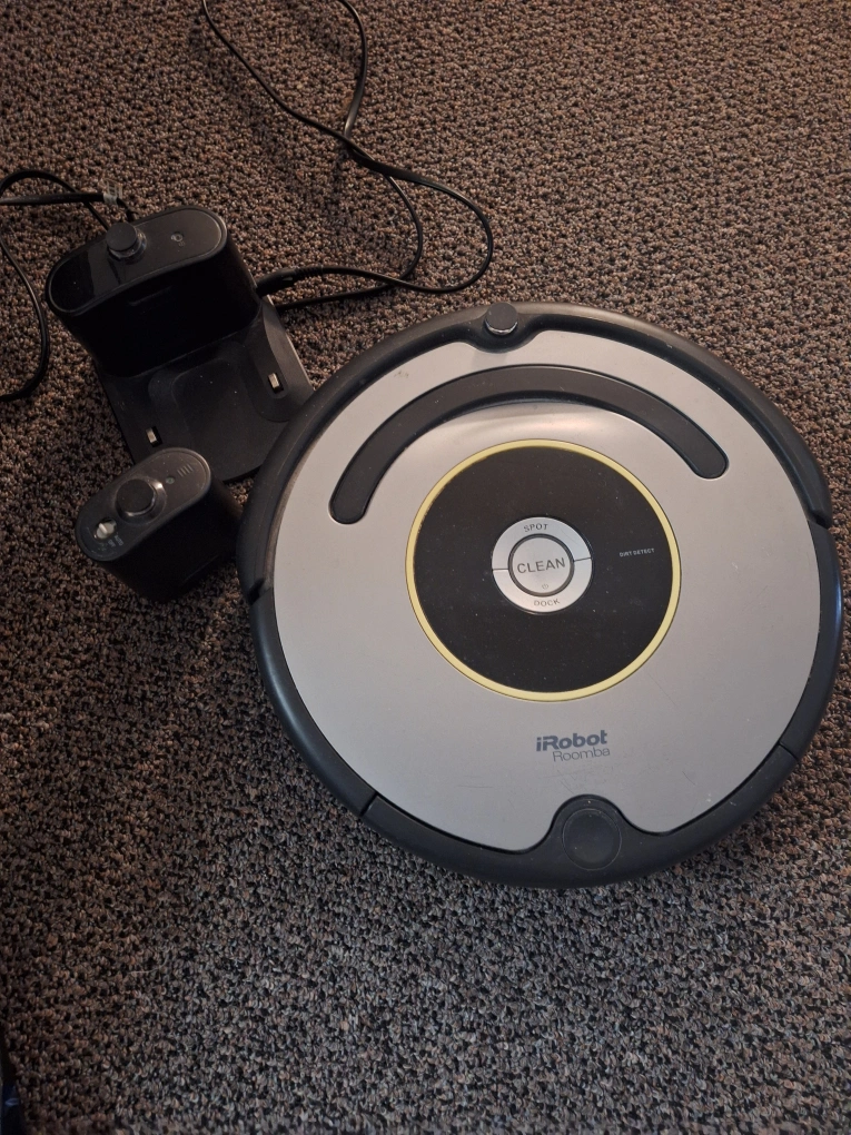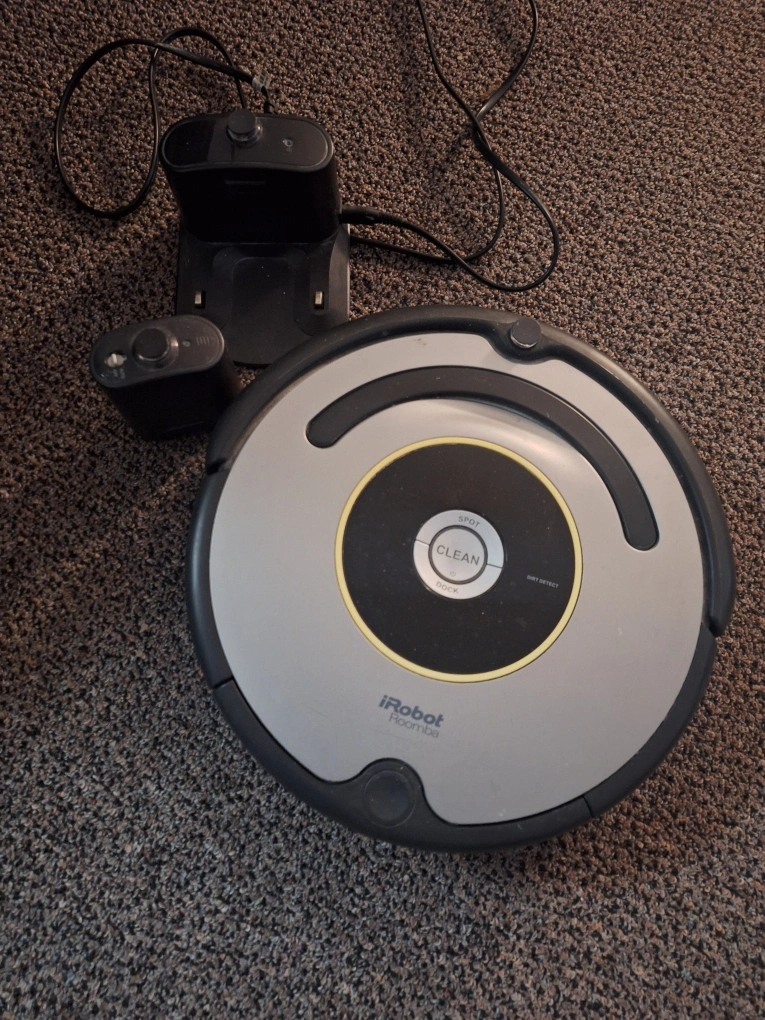 Selling an iRobot Roomba vacuum cleaner. It comes with its charging dock and an extra charging adapter. It's been well-used but still has plenty of life left for keeping your floors clean